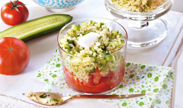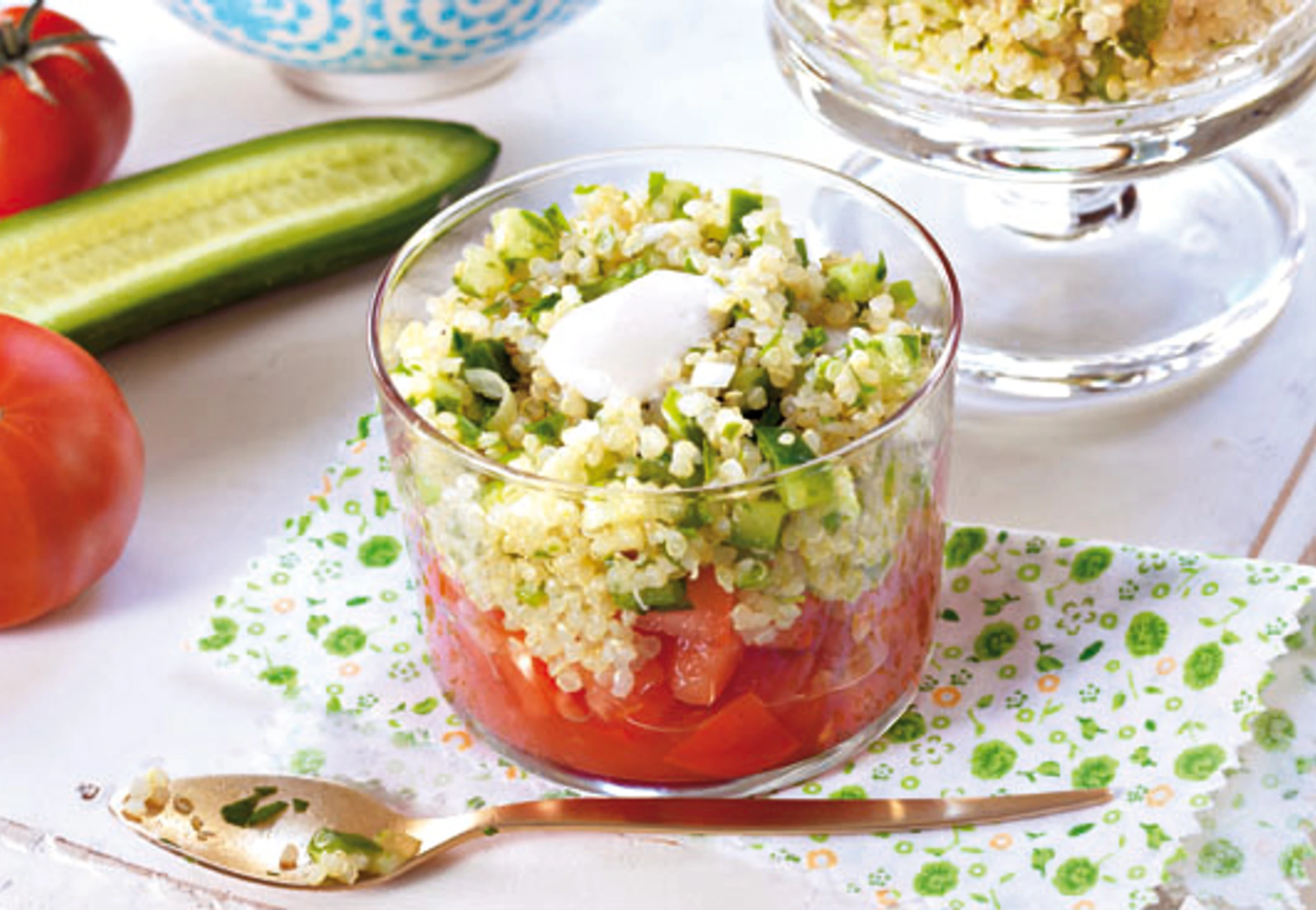 Gurke klein würfeln. Knoblauch schälen, fein hacken. Jungzwiebeln putzen, in Ringe schneiden. Petersil- und Minzeblätter abzupfen und fein hacken, mit Jungzwiebeln, Gurke und Quinoa vermischen, mit Salz und Pfeffer abschmecken. Salat etwas durchziehen lassen. Paradeiser klein würfeln.