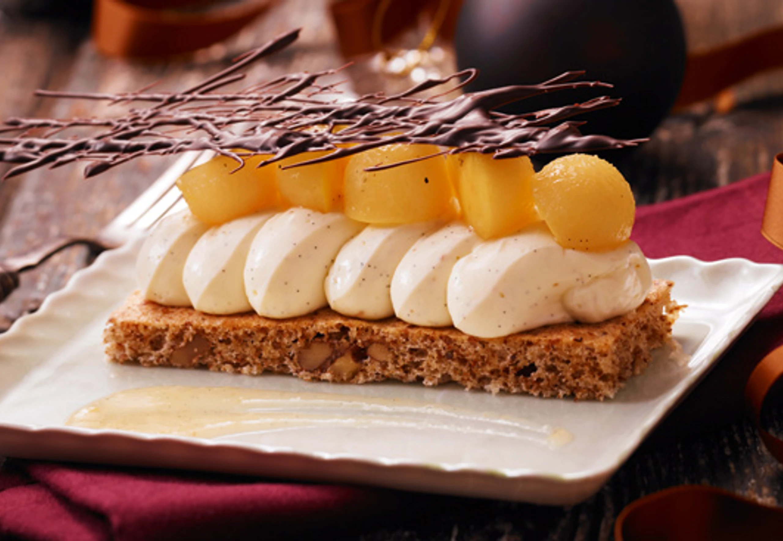 - Creme auf die Schnitten dressieren, mit Quittenkugeln und -sauce garnieren. Eventuell mit Schokogitter dekorieren.