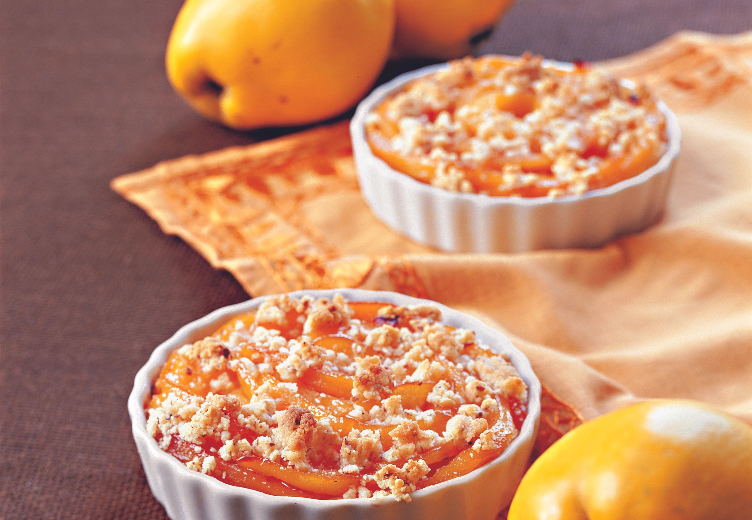 Für die Topfenmasse alle Zutaten verrühren und auf dem Teig verteilen. Quitten darauf legen. Restlichen Teig auf die Quitten bröseln. Tartelettes im Rohr (mittlere Schiene) ca. 35 Minuten backen. Lauwarm servieren.