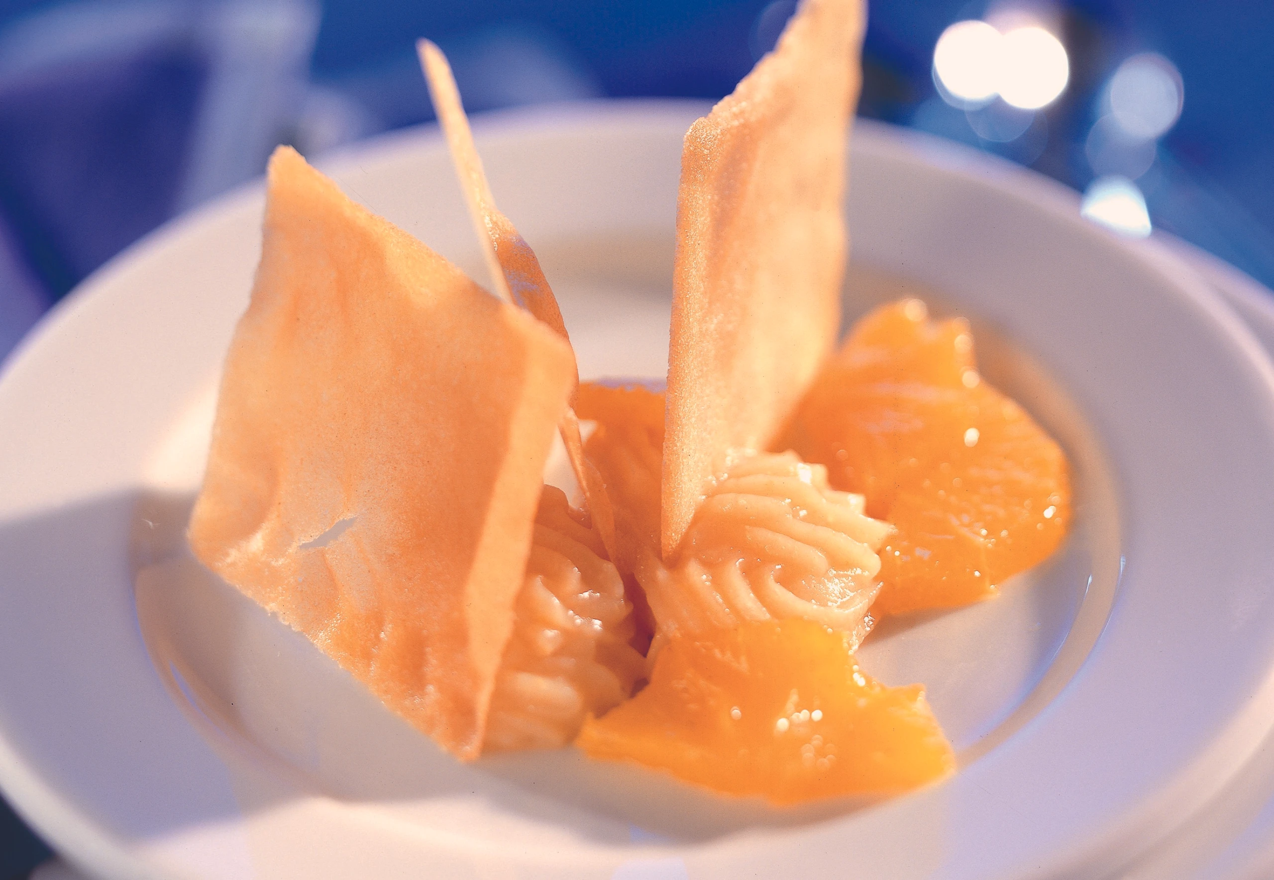 Quittenmus in einen Dressiersack mit Sterntülle füllen und kleine Krapferln auf Teller dressieren. Creme mit halbierten Orangenscheiben und Knusperblättern garnieren.