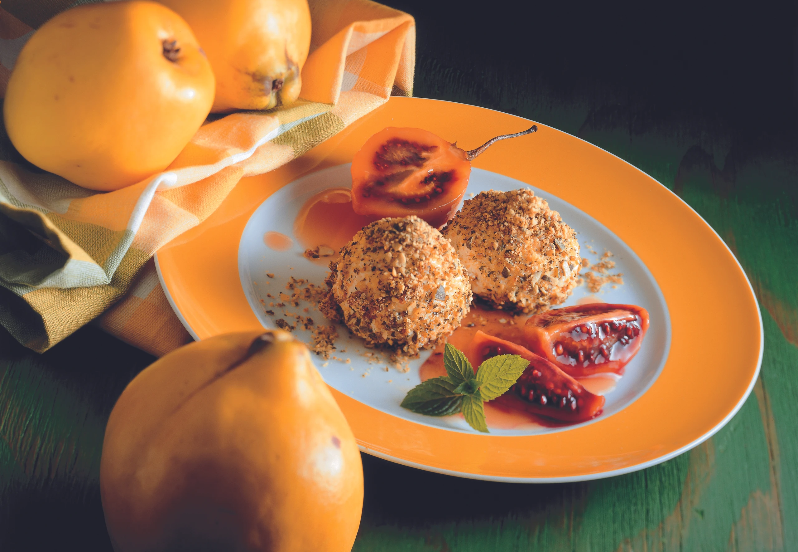 Krokant fein hacken und auf einen flachen Teller oder eine Platte geben. Aus dem Quittenmus mit einem Eisportionierer Kugeln (oder mit einem Suppenlöffel Nockerl) ausstechen. Quittennockerl behutsam im Kürbiskrokant wälzen, mit den marinierten Tamarillos (siehe Rezept) anrichten.