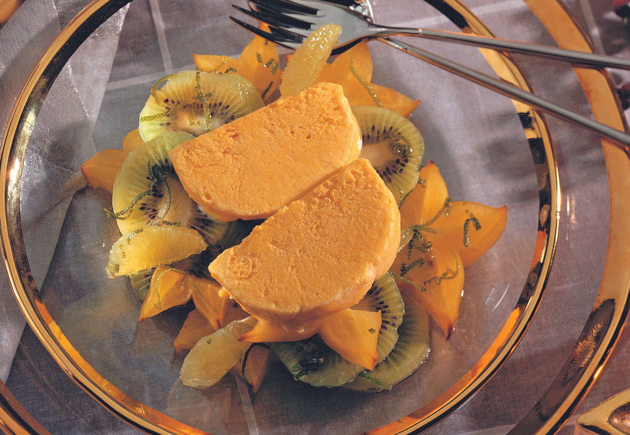Parfait aus der Form stürzen, die Frischhaltefolie abziehen. Parfait in Scheiben schneiden und auf dem Kiwi-Karambola-Salat anrichten.