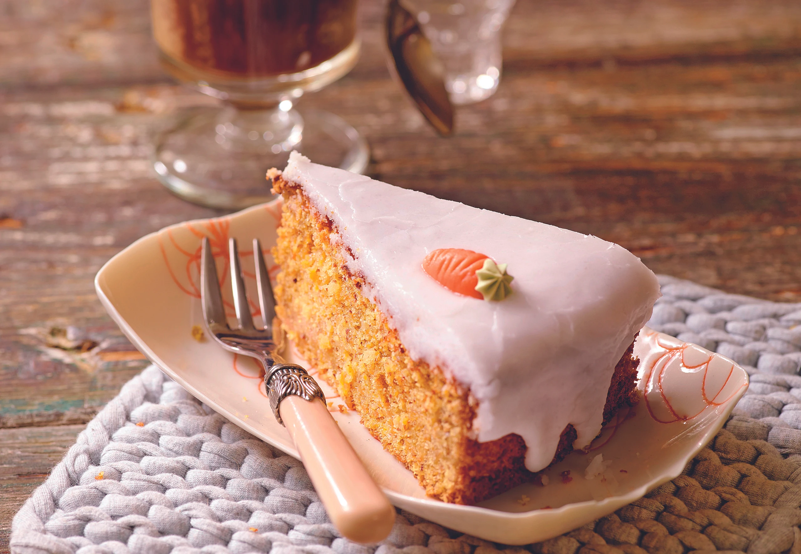 - Für die Glasur Zucker, Zitronensaft und Schnaps glatt verrühren. Zuckerglasur auf der Torte verteilen, mit den Marzipan-Karotten garnieren.