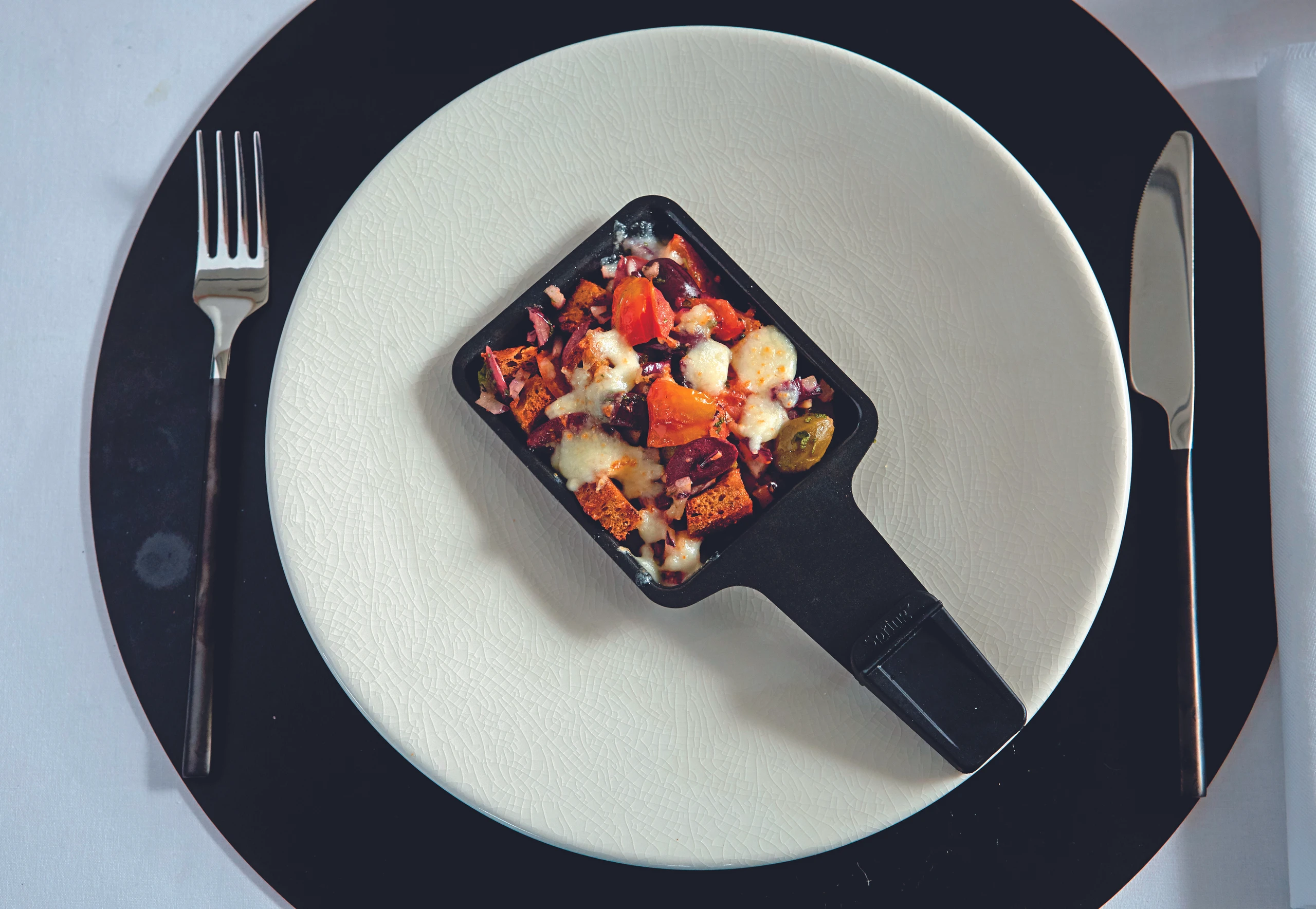Raclette: Brotsalat-Pfännchen mit Mozzarella und Basilikum