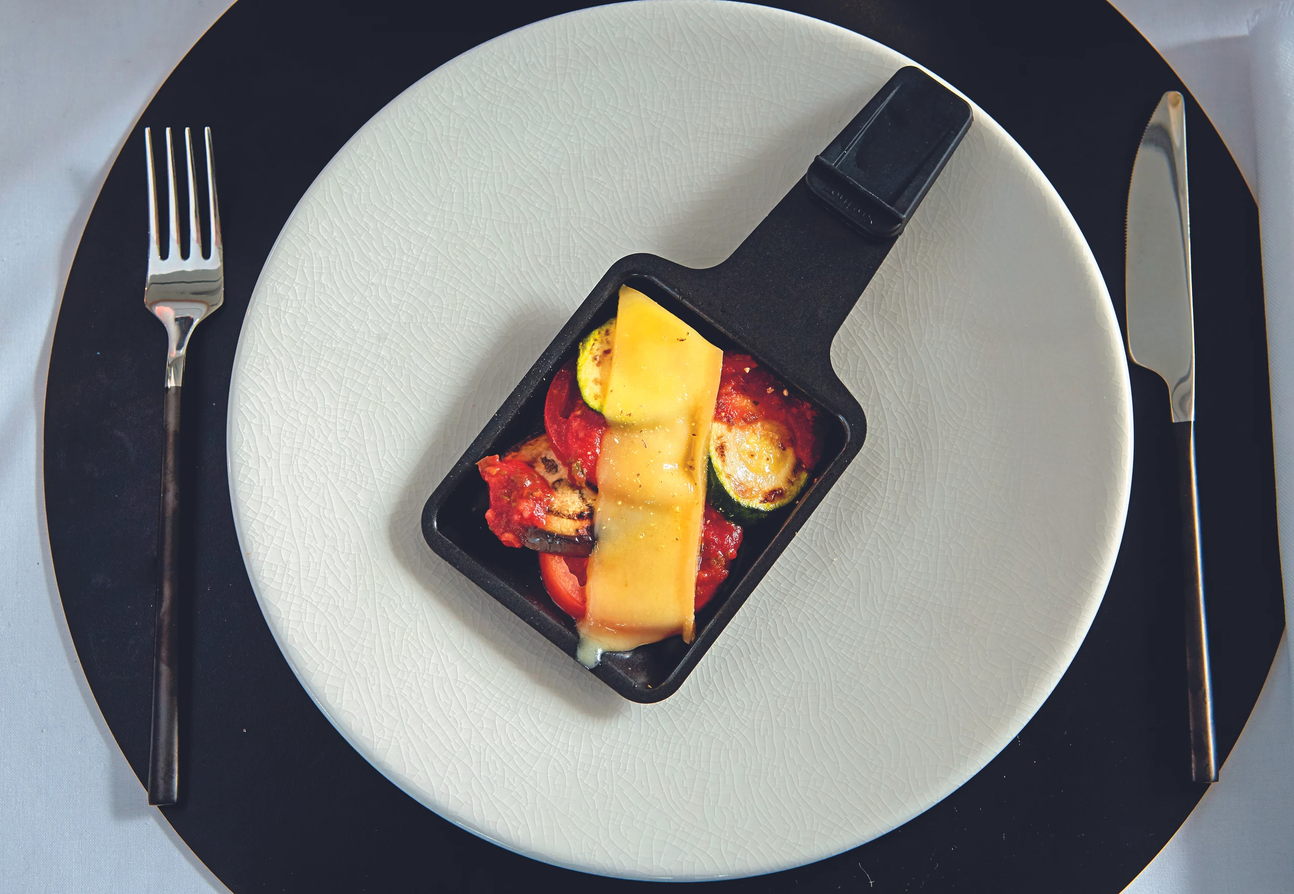 Zucchini-, Melanzani- und Paradeiserscheiben in den Pfännchen verteilen, mit der Passata übergießen und mit Käsescheiben belegen. Unter dem Raclettegrill überbacken.