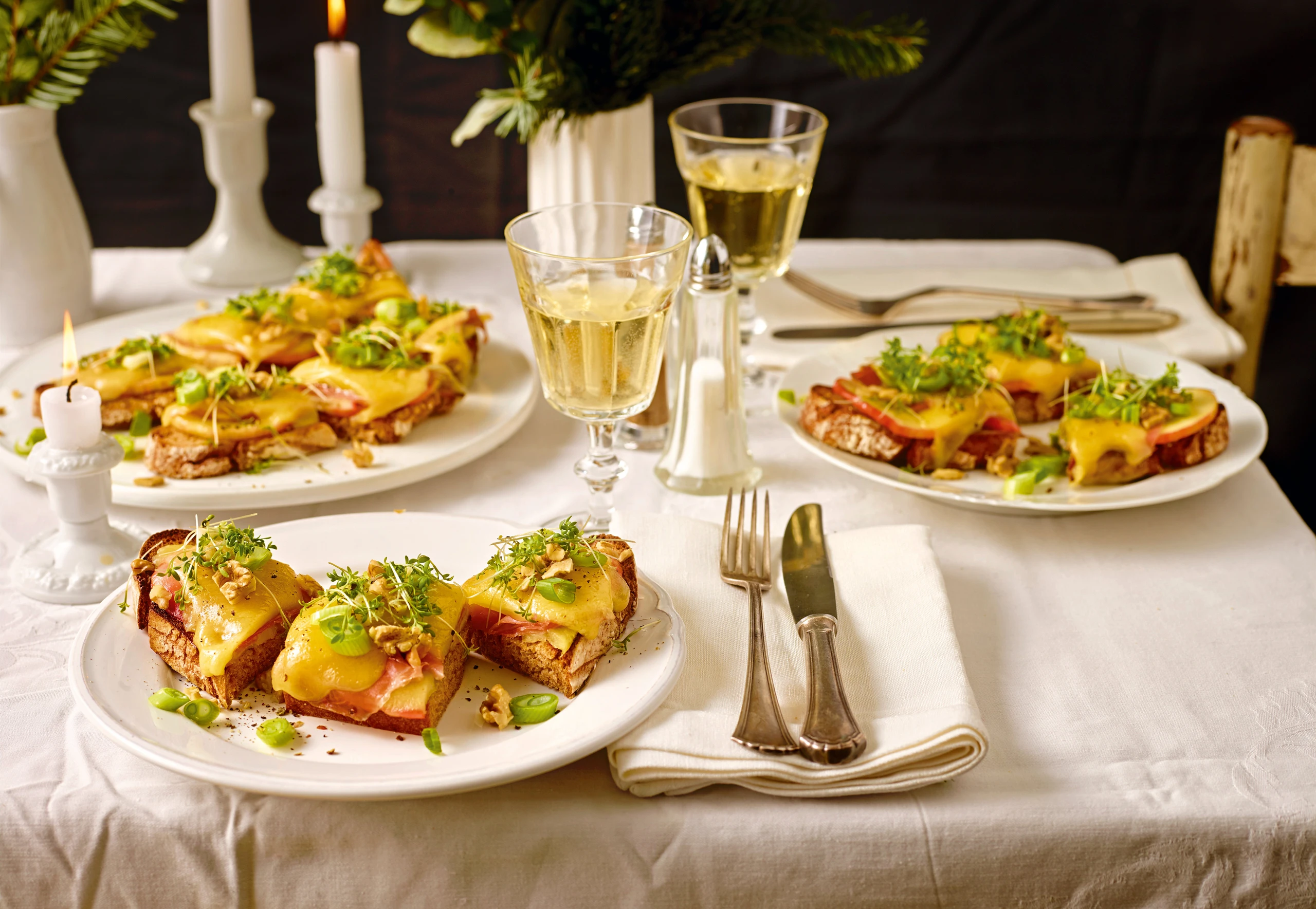 Butter bis zum Aufschäumen erhitzen und die Apfelscheiben darin beidseitig kurz braten. Brote mit Apfelscheiben, Prosciutto und Käsescheiben belegen.