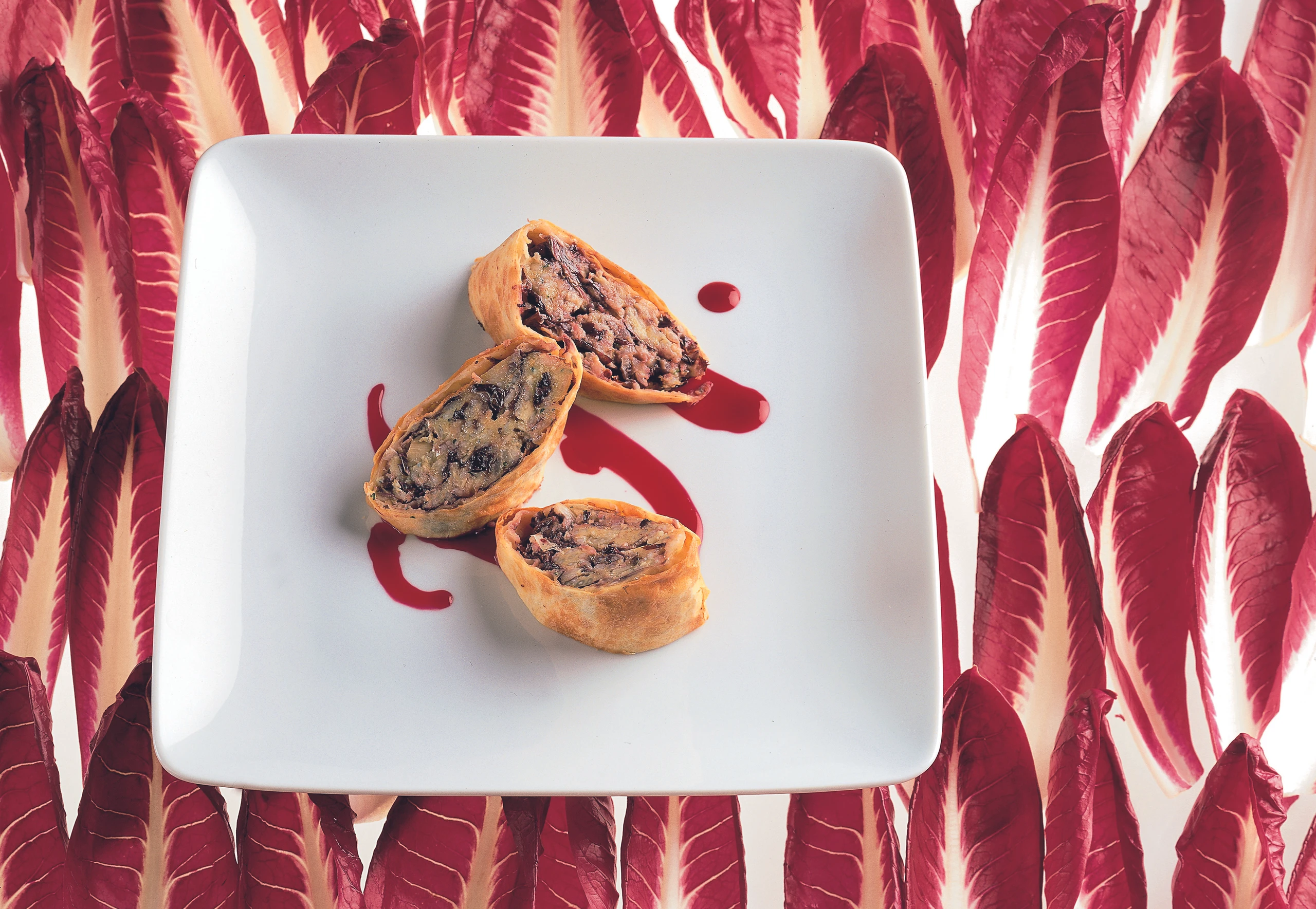 Für die Fülle Reis in Butter anschwitzen, mit Milch aufgießen und unter Rühren dick einkochen. Vom Herd nehmen und ein wenig abkühlen lassen. Radicchio putzen, vierteln und quer in 1 cm breite Streifen schneiden. Ei, Petersilie, Käse, Brösel und Radicchio in die Reismasse rühren und mit Salz und Pfeffer würzen.