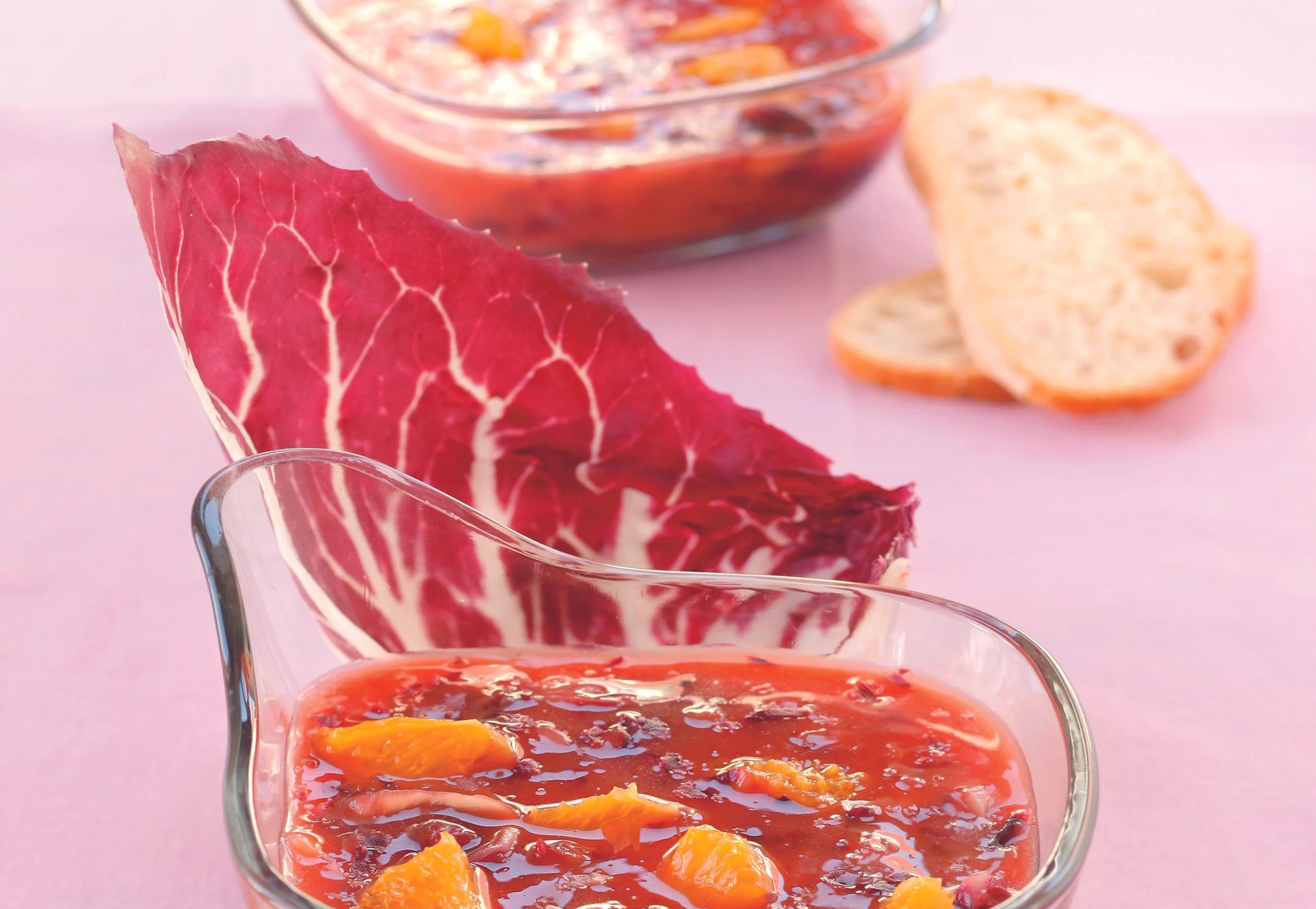 - Radicchio vierteln und den Strunk ausschneiden. Radicchio quer in Streifen schneiden und in Öl anschwitzen. Orangensaft zugießen und Honig einrühren. Suppe mit Salz und Ingwer würzen und aufkochen. Vom Herd nehmen und grob pürieren, es sollten noch Salatstreifen erkennbar sein.