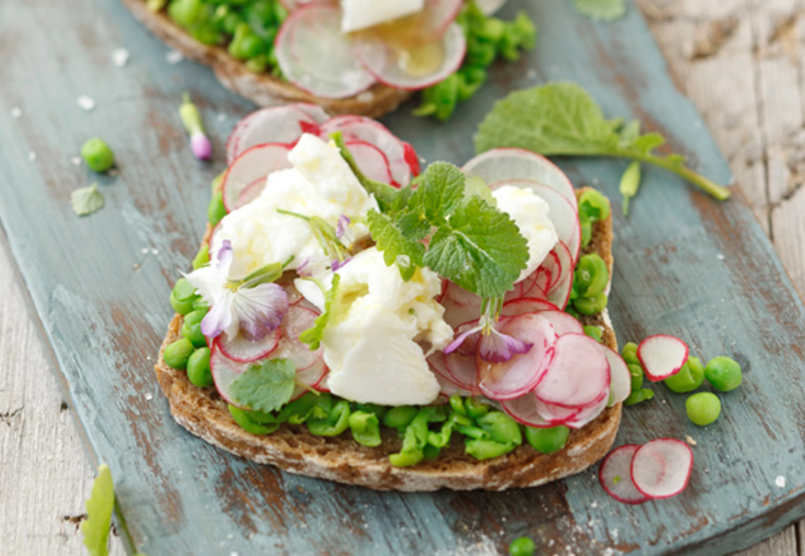 Erbsen 2 bis 3 Minuten kochen, kalt abschrecken, mit einer Gabel grob zerdrücken und auf den Broten verteilen.