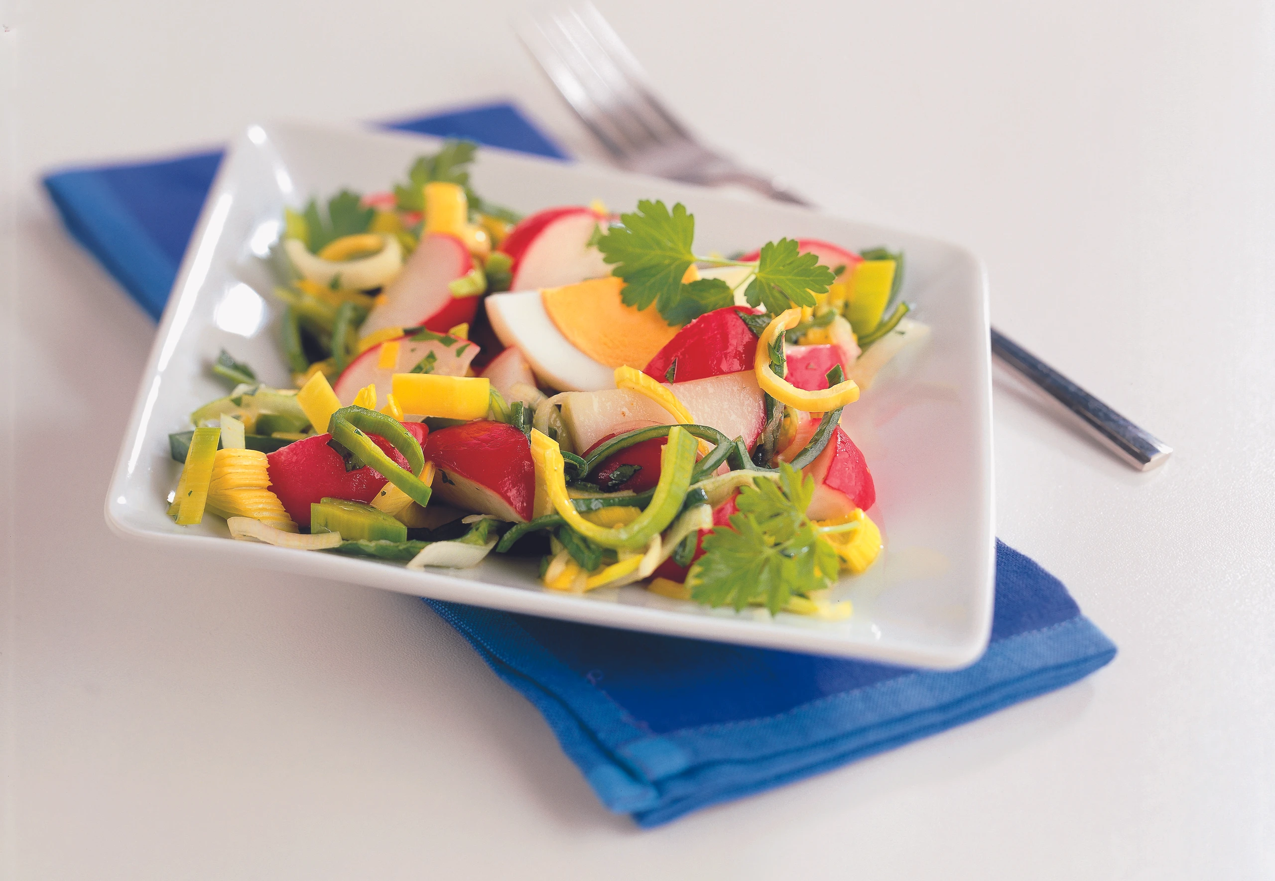 Radieschen und Lauch mit der Marinade vermischen und ca. 5 Minuten ziehen lassen. Salat mit Ei garniert servieren.