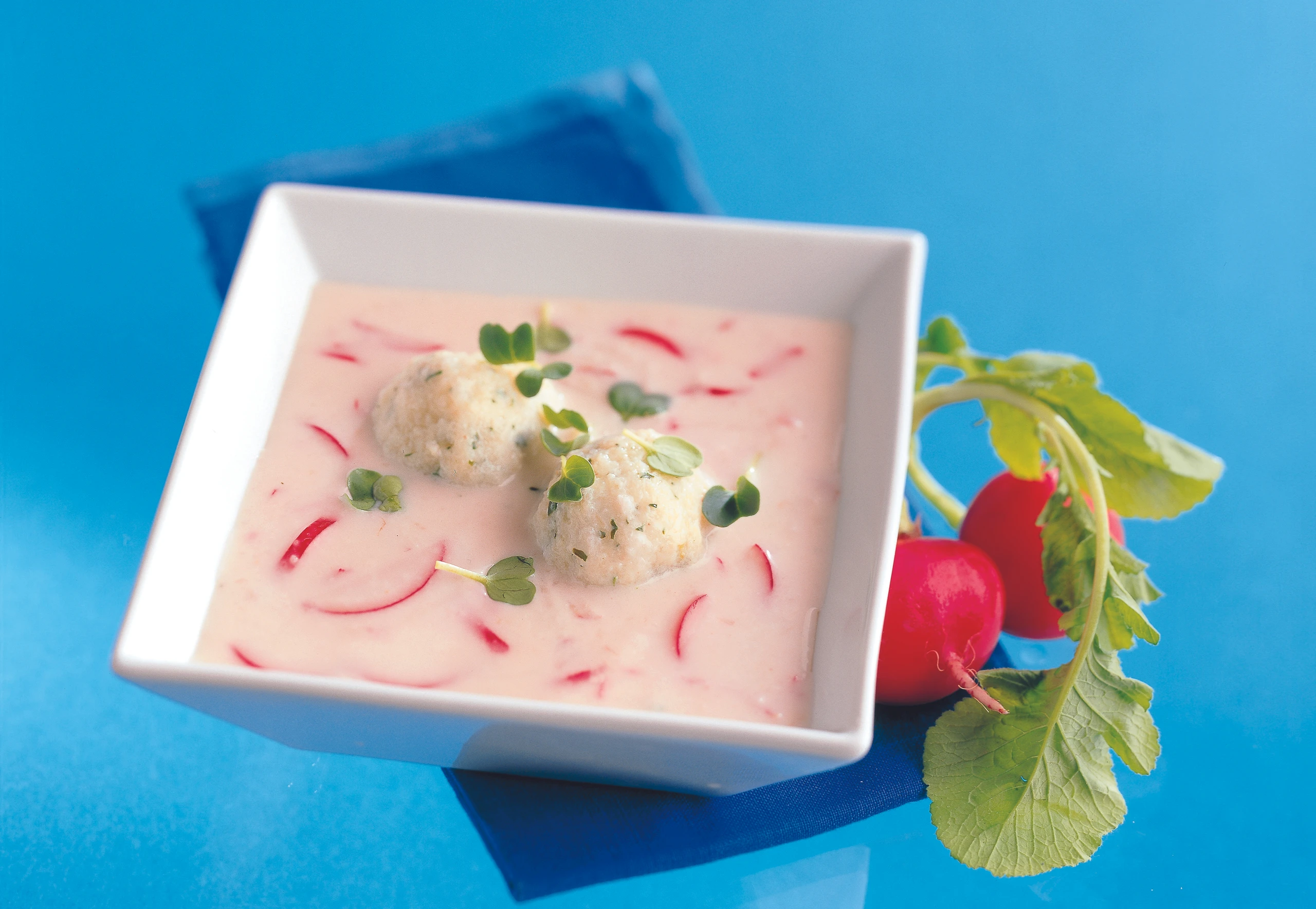 Übrige Radieschen in die Suppe rühren und fein pürieren. Knöderl aus dem Wasser heben und abtropfen lassen. Suppe mit Knöderln anrichten, mit der restlichen Kresse und eventuell mit in Streifen geschnittenen Radieschen bestreut servieren.