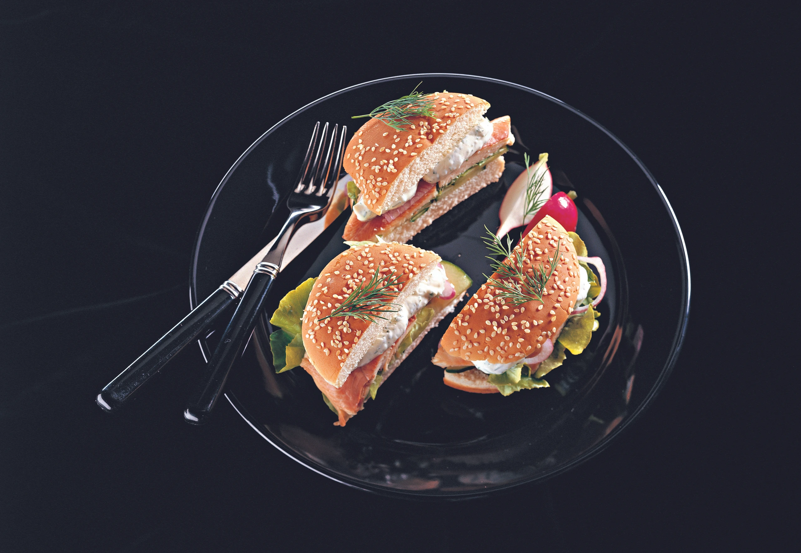 Laibchen-Böden mit Salatblättern, Gurkenscheiben und Forellenfilets belegen. Dillsauce und Zwiebelringe darauf verteilen. Laibchen-Deckel darauf legen.