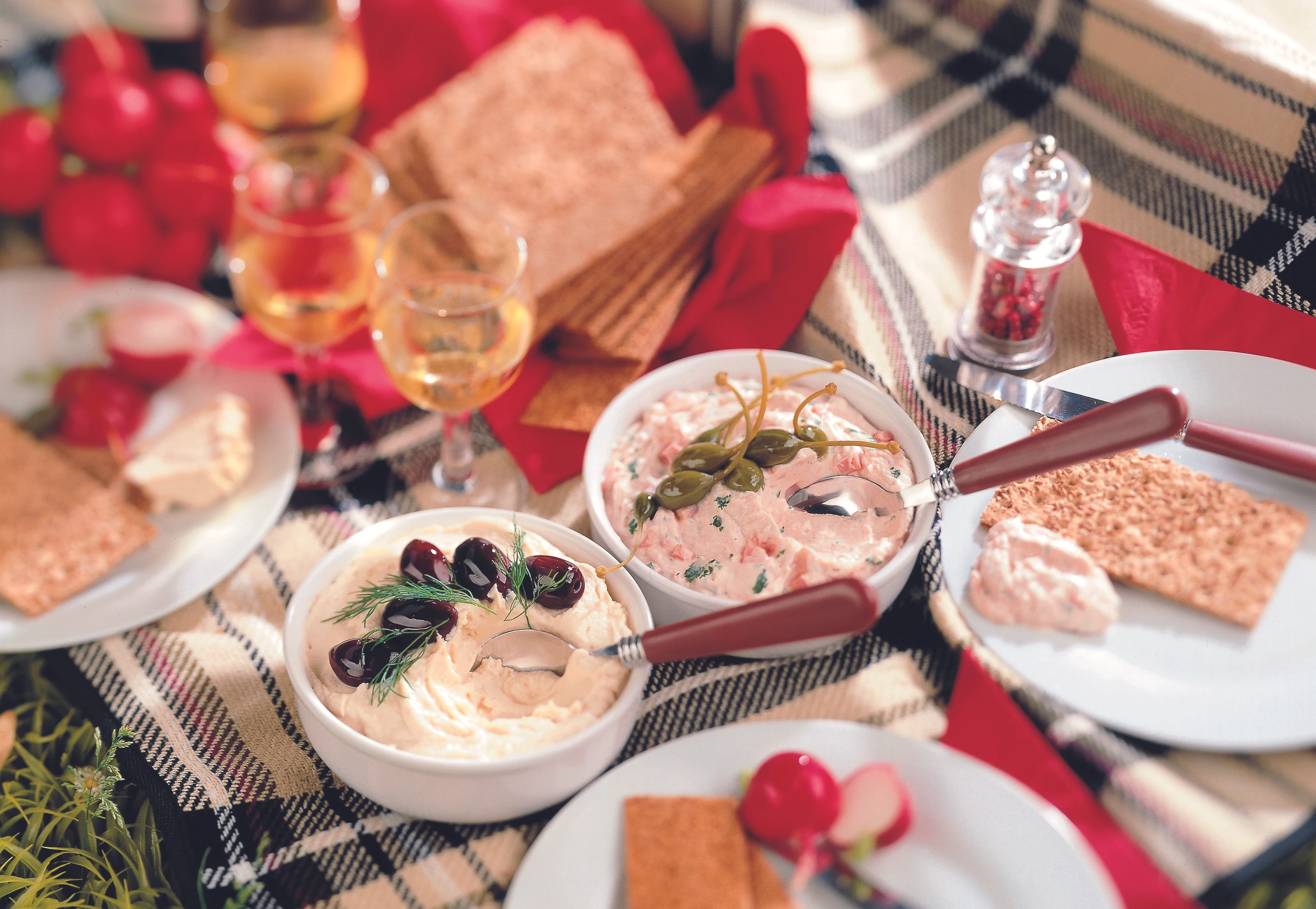 Aufstriche mit Kapern und Oliven garnieren, Knäckebrot und Radieschen dazu essen.