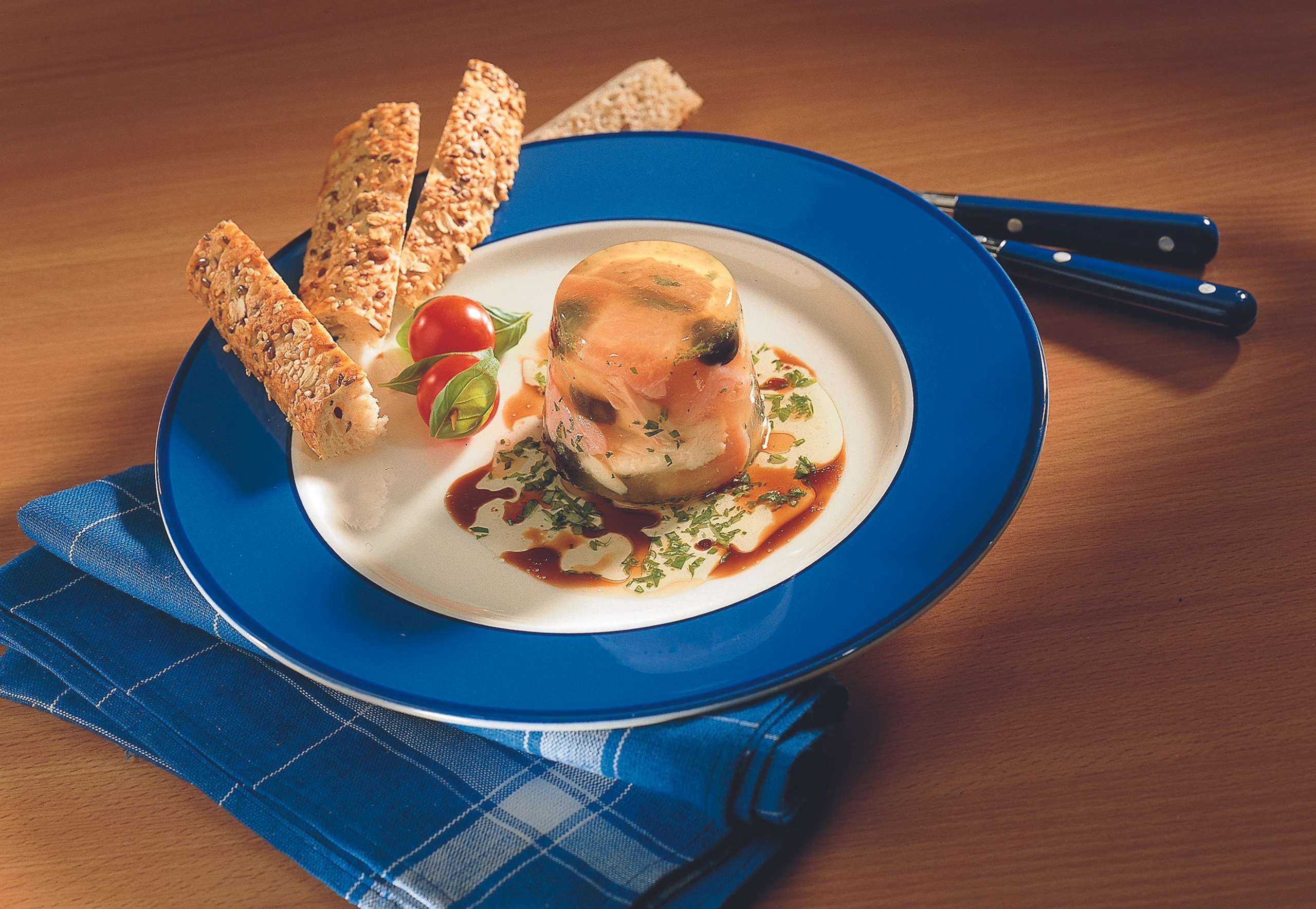 Soviel Fond in die Förmchen gießen, dass der Boden gut bedeckt ist; im Kühlschrank stocken lassen (ca. 15 Minuten).