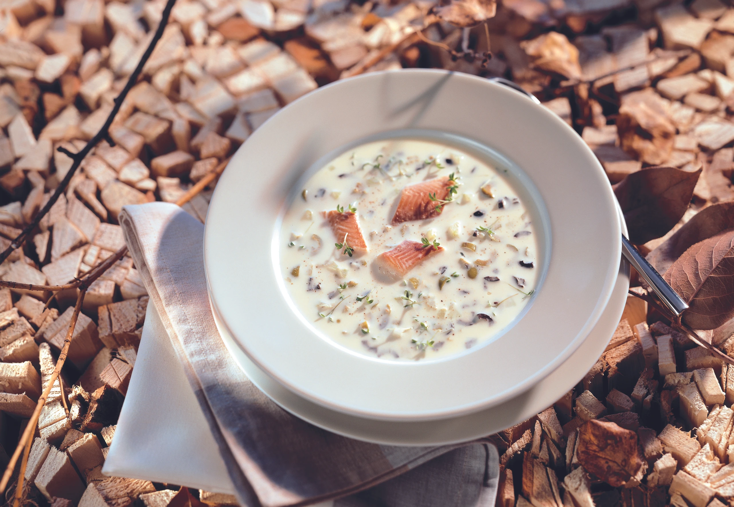 Kresseblättchen von den Stielen schneiden. Suppe in vorgewärmte Teller schöpfen, mit den Forellenstücken und Kresseblättchen garniert servieren.