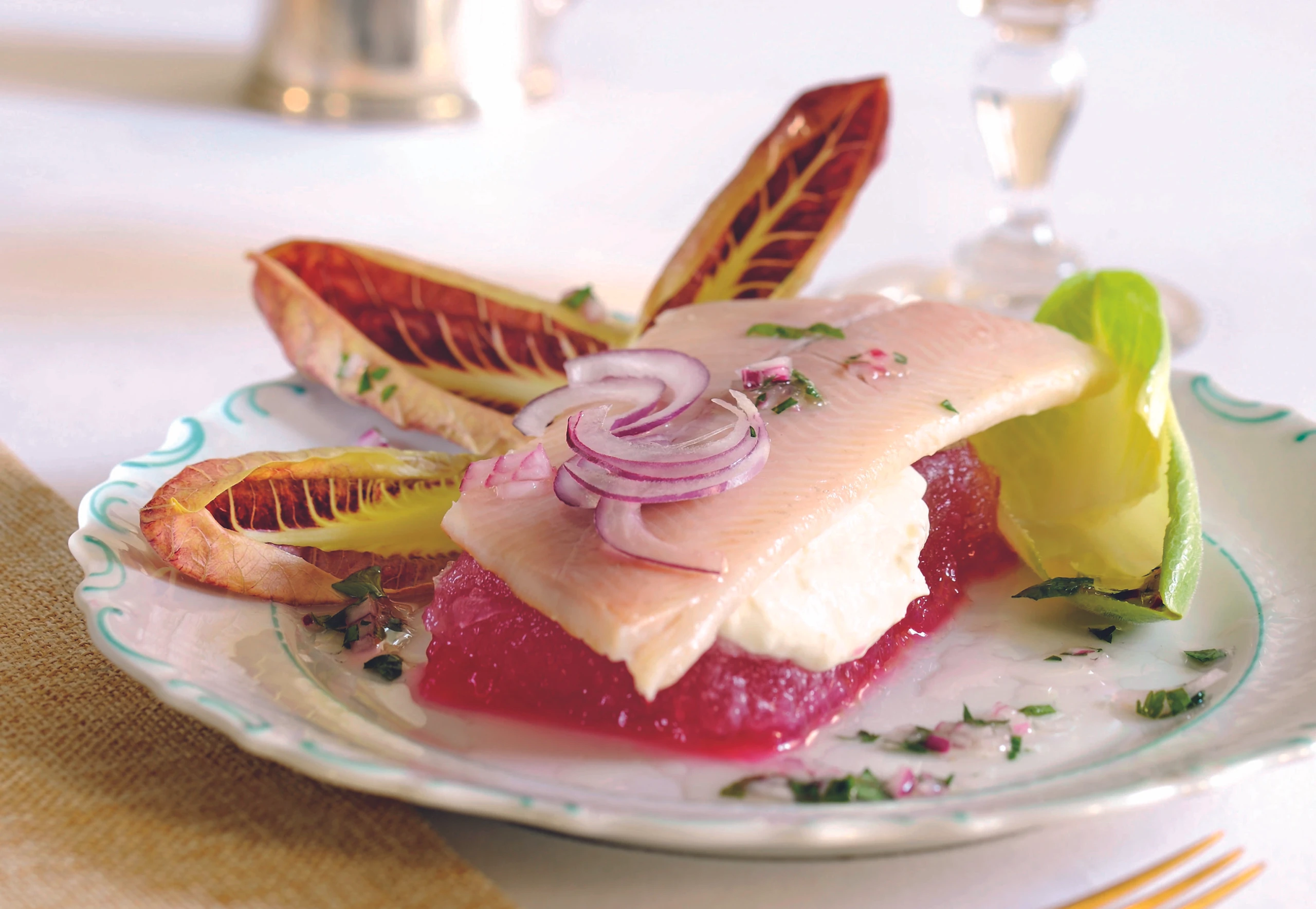 Mousse auf ein Brett stürzen, in Stücke schneiden, mit Radicchio und Chicorée anrichten. Kren-Creme und Forellenfilets daraufgeben, mit Zwiebelscheiben und Petersilie garnieren. Das Dressing darauf verteilen.