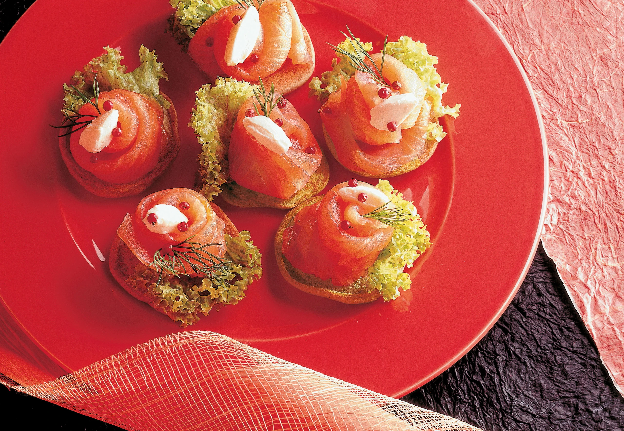 Blinis auf Tellern anrichten und mit dem Lachs dekorativ belegen. Mit Dillzweigen, rosa Pfefferkörnern, Crème fraîche und Blattsalat garniert servieren.