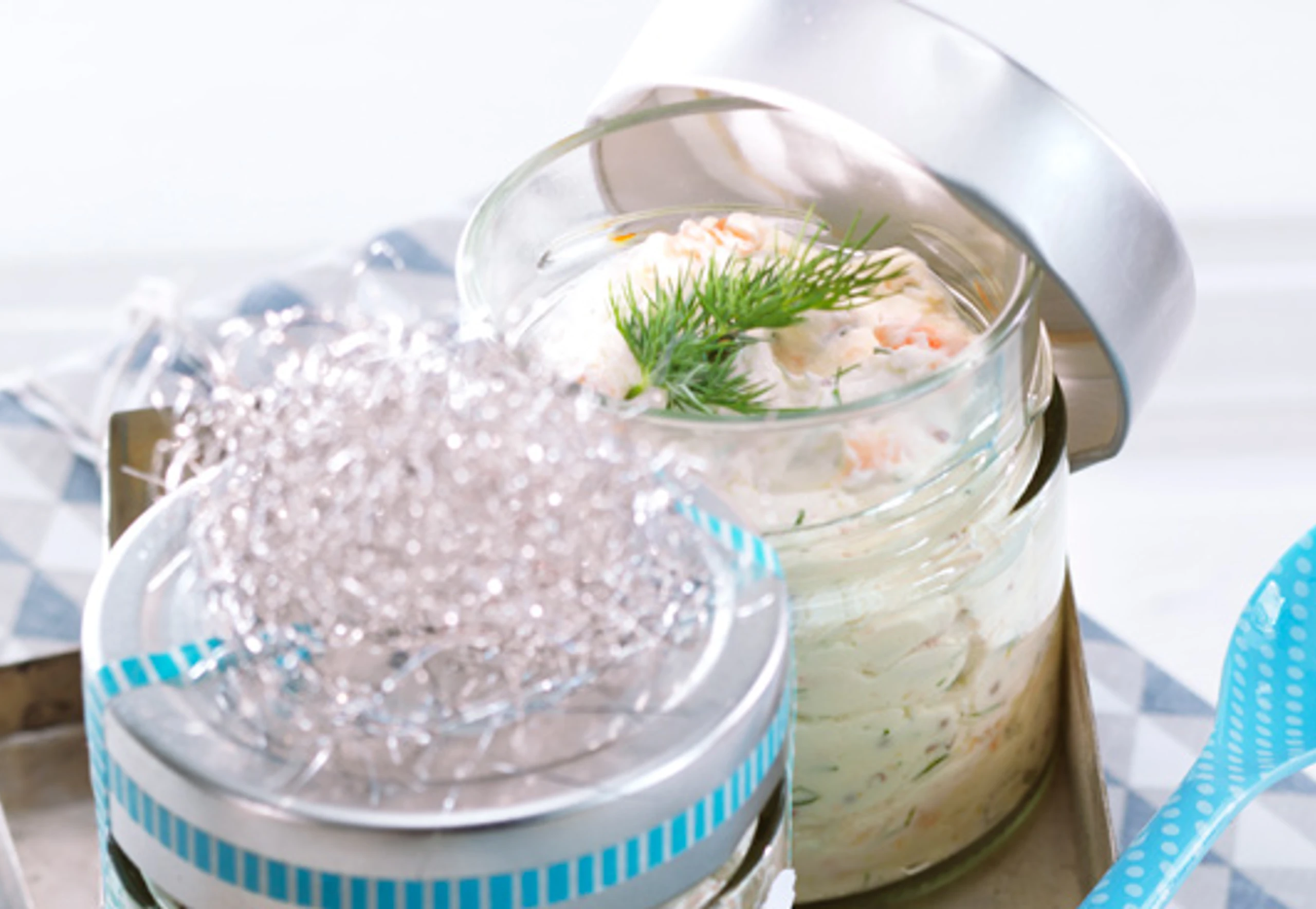 - Räucherlachs klein schneiden. Frischkäse mit Crème fraîche und Senf glatt rühren, Räucherlachs, Dille und Zitronenschale untermengen, mit Salz und Pfeffer würzen. Lachscreme in Gläser füllen, gekühlt lagern.