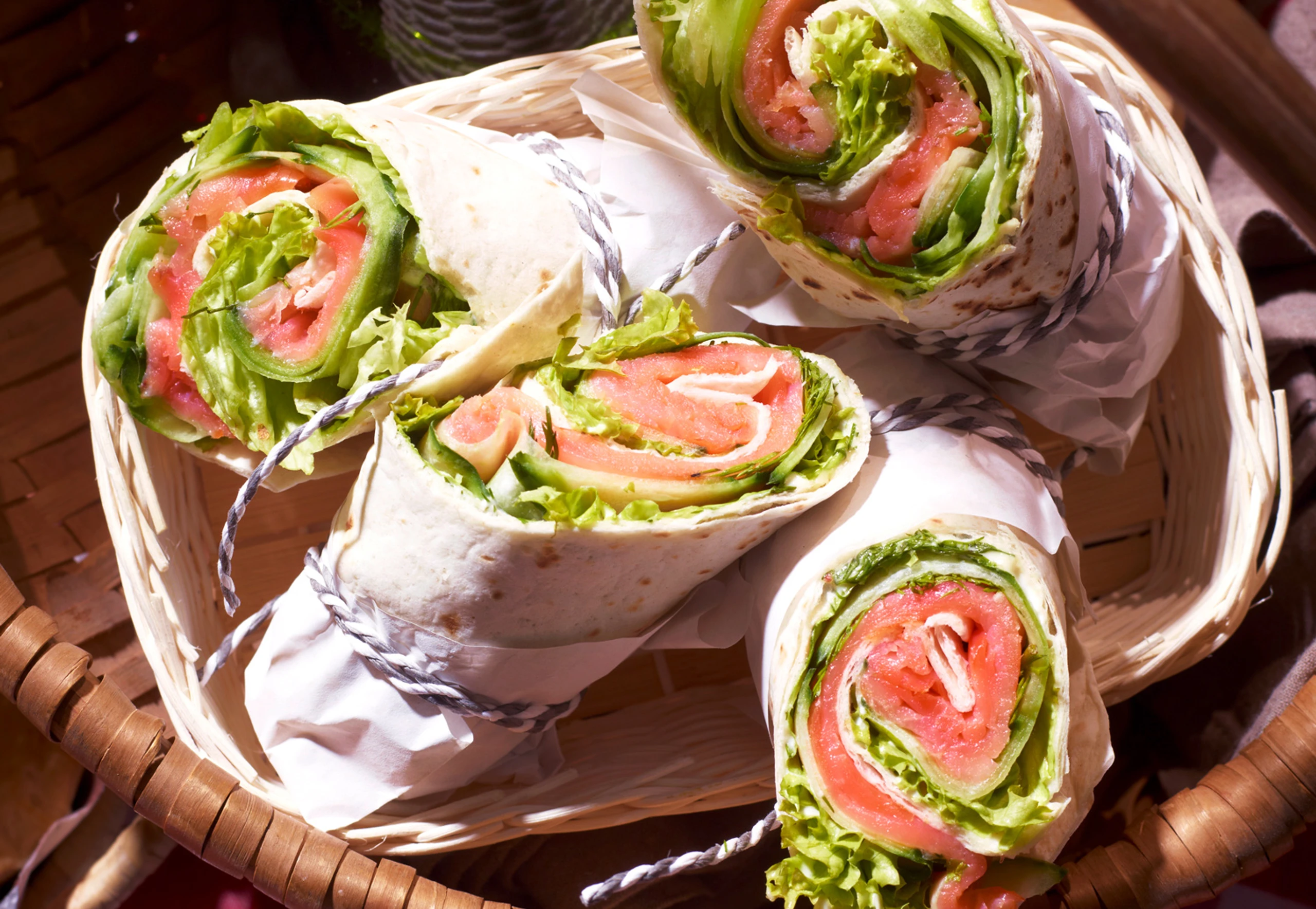 Gusto-Tipp: Damit die Wraps nicht welken, wickelt man sie zusätzlich in Frischhaltefolie. Statt Räucherlachs schmeckt auch gekochter Schinken vorzüglich.