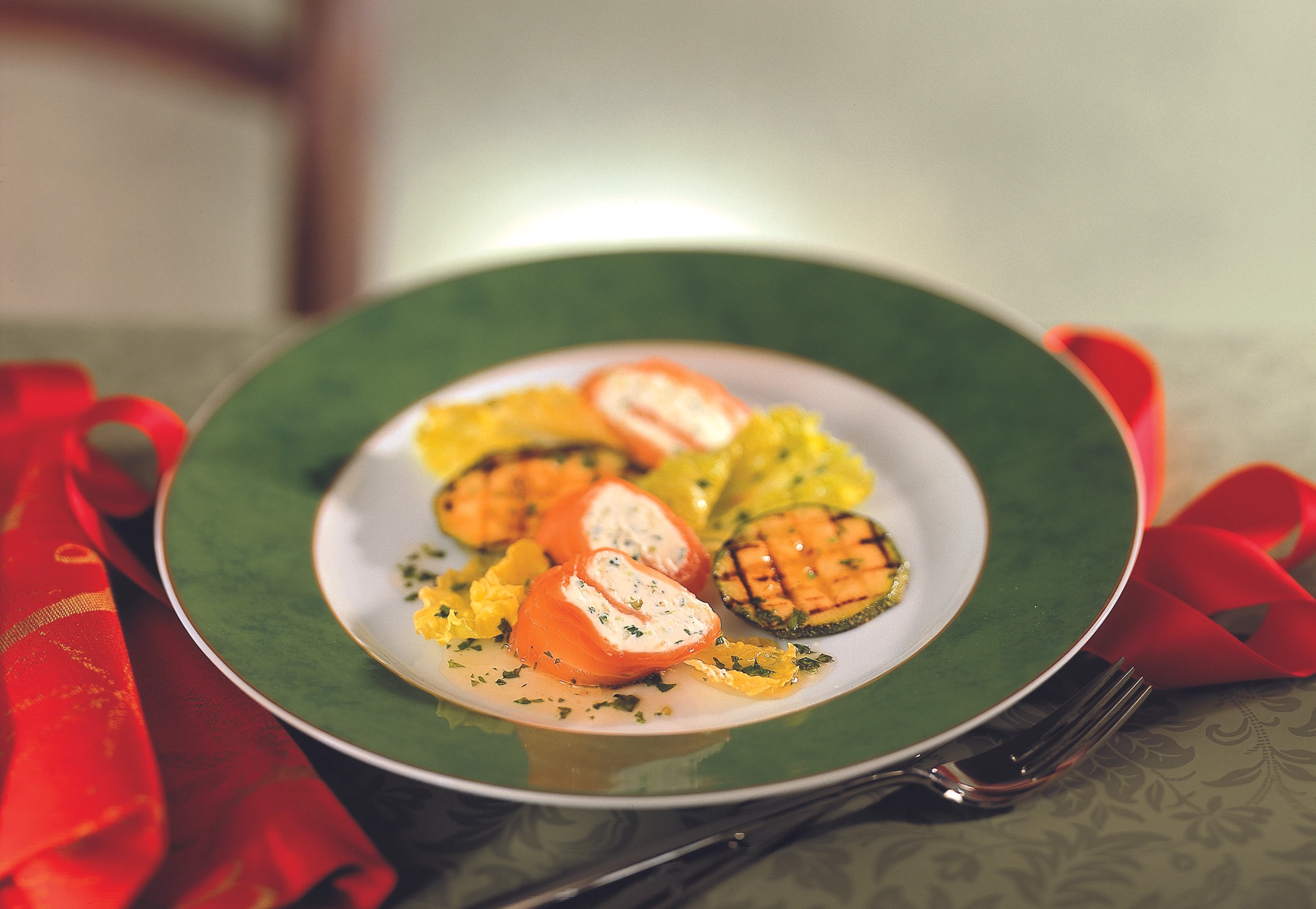 Räucherlachsröllchen mit marinierten Zucchini