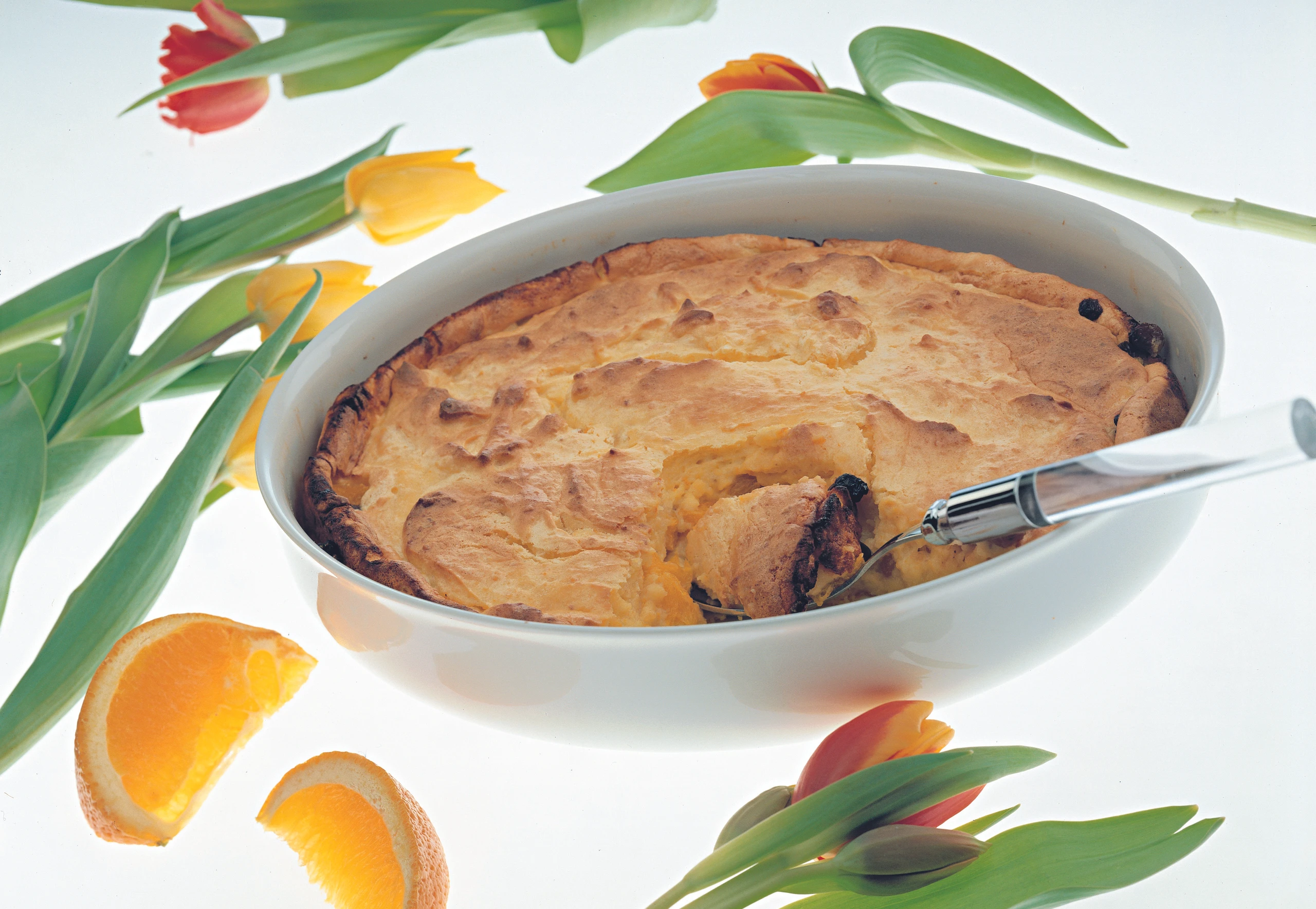 Eiklar mit restlichem Kristallzucker zu cremigem Schnee schlagen und unter die lauwarme Grundmasse ziehen. Ein Drittel der Masse in die Auflaufform füllen und mit Orangenfilets und Rosinen bestreuen. Übrige Masse gleichmäßig darauf verstreichen. Auflauf im vorgeheizten Rohr (unterste Schiene / Gitterrost) ca. 50 Minuten backen. Den Rahmauflauf in der Form servieren und bei Tisch mit einem Löffel portionieren.