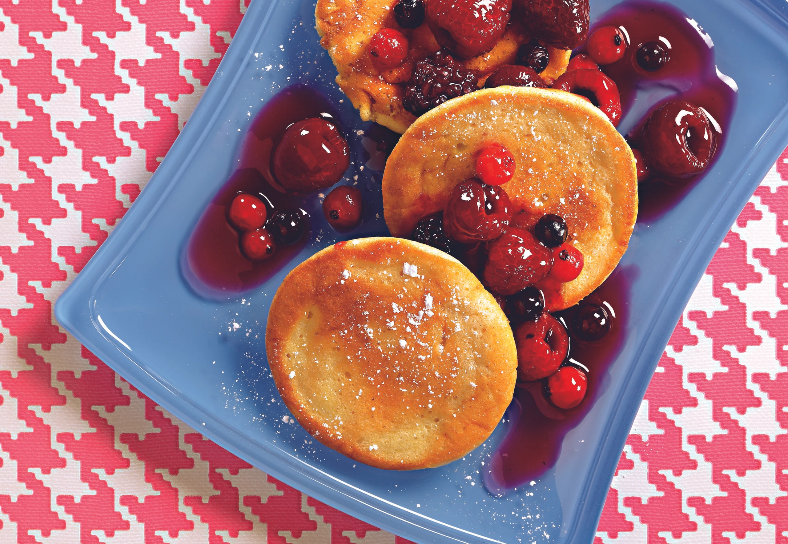 - Eine beschichtete Pfanne mit Butter ausstreichen und erhitzen. 6 Teigportionen hineinsetzen und beidseitig backen. Dalken herausheben und im Rohr warm stellen. Aus der übrigen Masse nochmals 6 Dalken backen. Je 3 Dalken mit den Beeren anrichten und mit Staubzucker bestreut servieren.