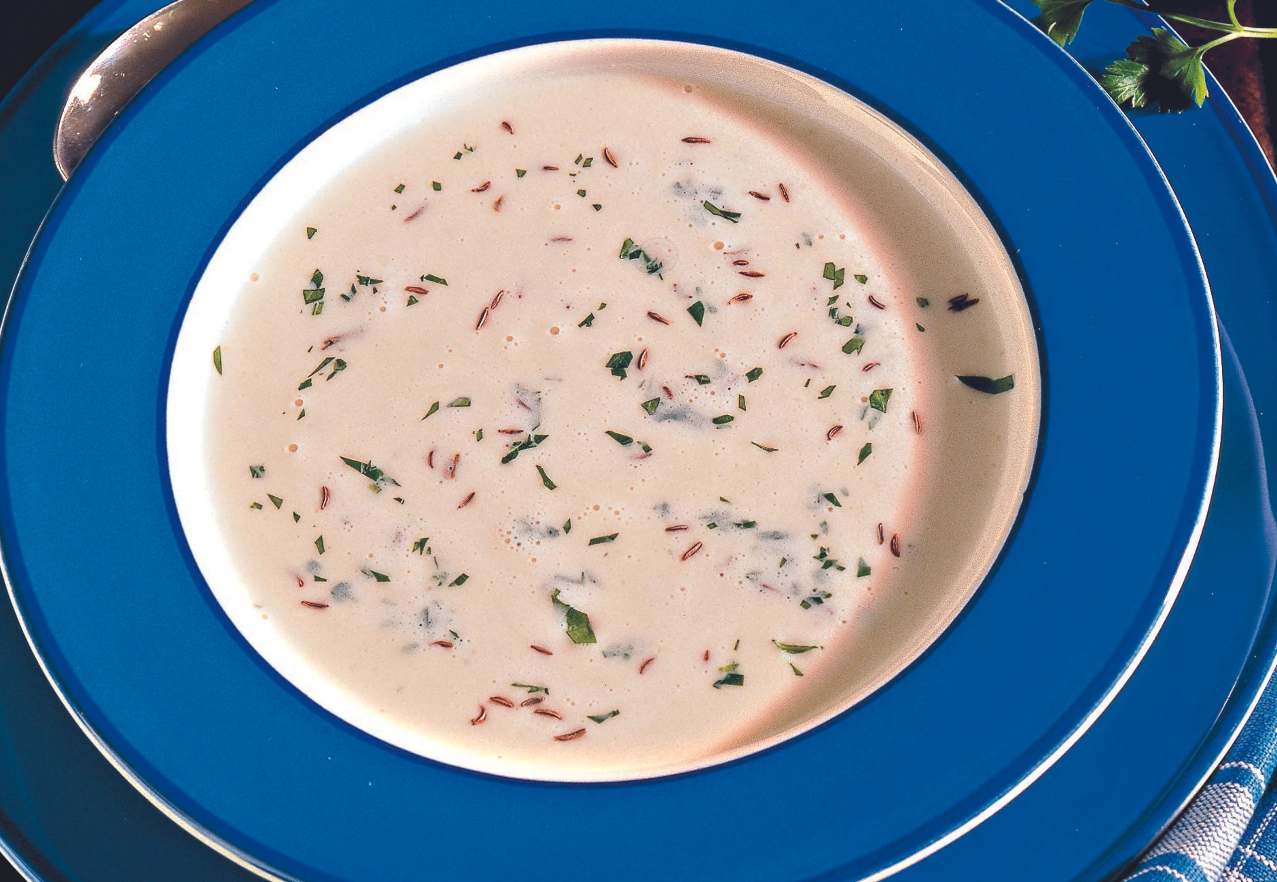 Sauerrahm mit Mehl und 125 ml von der Suppe glattrühren. Restliche Suppe mit Salz, Pfeffer, 1 Spritzer Essig und ca. 1 TL Kümmel verrühren und aufkochen. Rahm einrühren, nochmals aufkochen. Suppe mit Kräutern bestreut servieren.