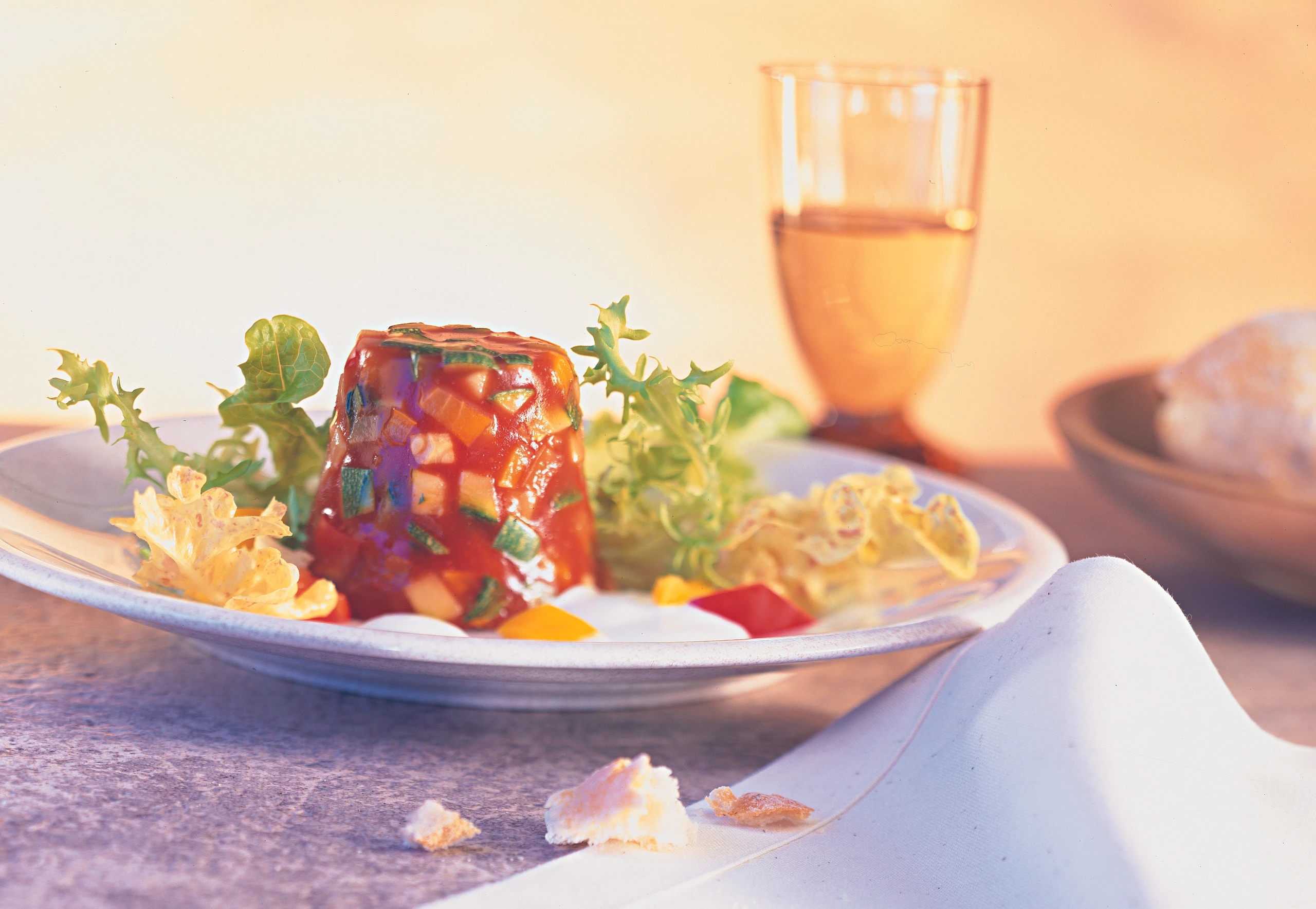 Gelatine in kaltem Wasser einweichen, gut ausdrücken und in das Gemüse rühren. Gemüse ein wenig abkühlen lassen, Petersil unterrühren. Gemüse in die Förmchen füllen, mit Frischhaltefolie zudecken und zum Festwerden für ca. 5 Stunden kühl stellen.