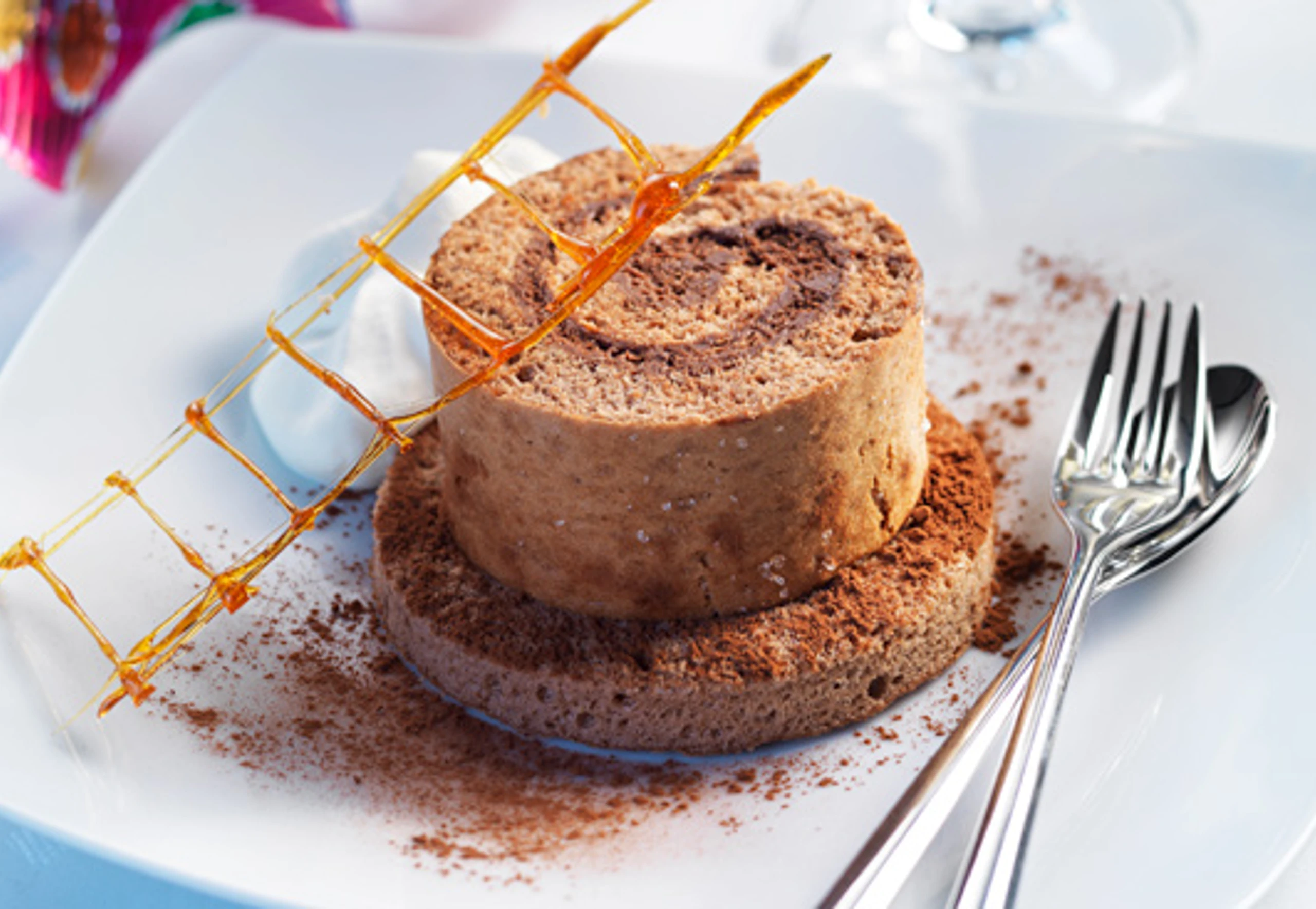 Backpapier mit Kristallzucker bestreuen, Biskuit herausnehmen, auf das Papier stürzen und auskühlen lassen. Mitgebackenes Papier abziehen. Mit einem Ausstecher (Ø 8 cm) 6 Scheiben ausstechen. Übriges Biskuit rechteckig zuschneiden, Schokoladecreme darauf verstreichen und zu einer Roulade rollen.