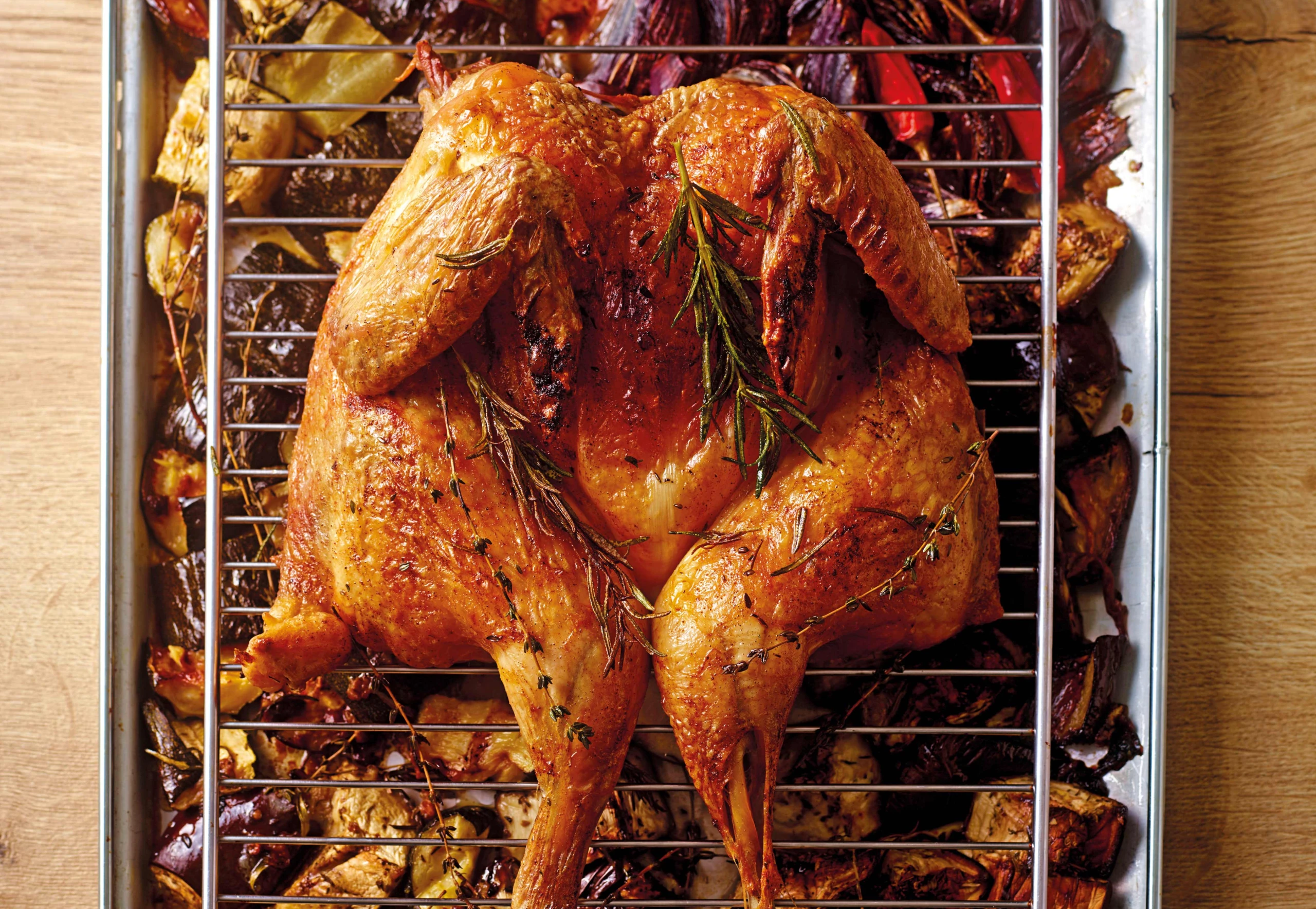 Rohr auf 200 °C Ober-/Unterhitze vorheizen. Tiefes Backblech und Gitterrost vorbereiten. Gemüse auf dem Blech verteilen und ins Rohr (untere Schiene) schieben. Huhn mit der Haut nach oben auf den Gitterrost legen, mit Paprikaöl bestreichen und eine Schiene über dem Gemüse ins Rohr schieben. Huhn und Gemüse ca. 1 Stunde braten. Nach halber Garzeit Gemüse mit Suppe untergießen und das Huhn mit Thymianund Rosmarinzweigen belegen.