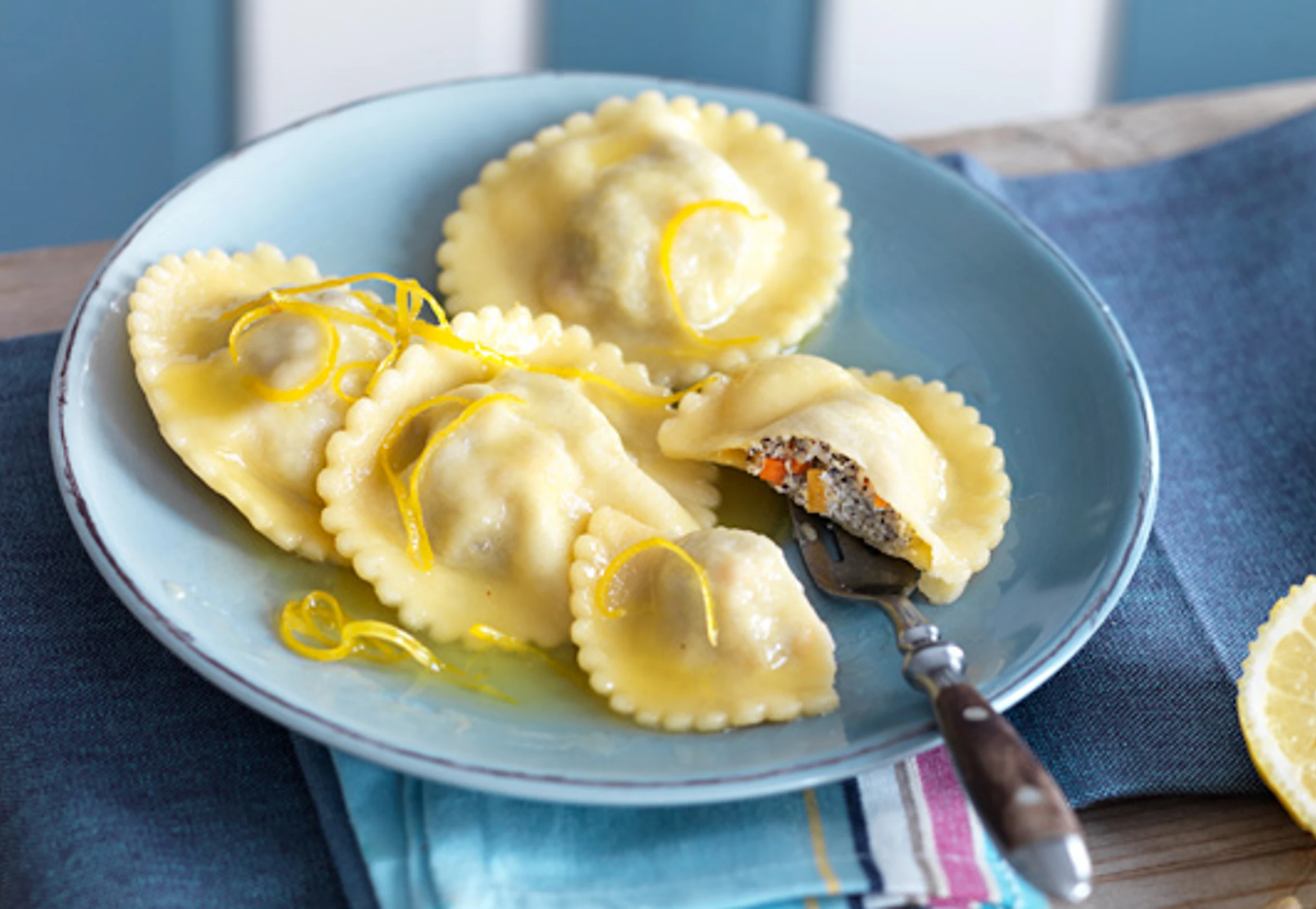 Für die Zitronenbutter Zitronenschale in feinen Streifen ablösen. Zitrone auspressen. Butter, Zucker, Zitronensaft, Zesten und 1 EL vom Kochwasser aufkochen. Ravioli darin schwenken, anrichten und mit der Butter übergießen.