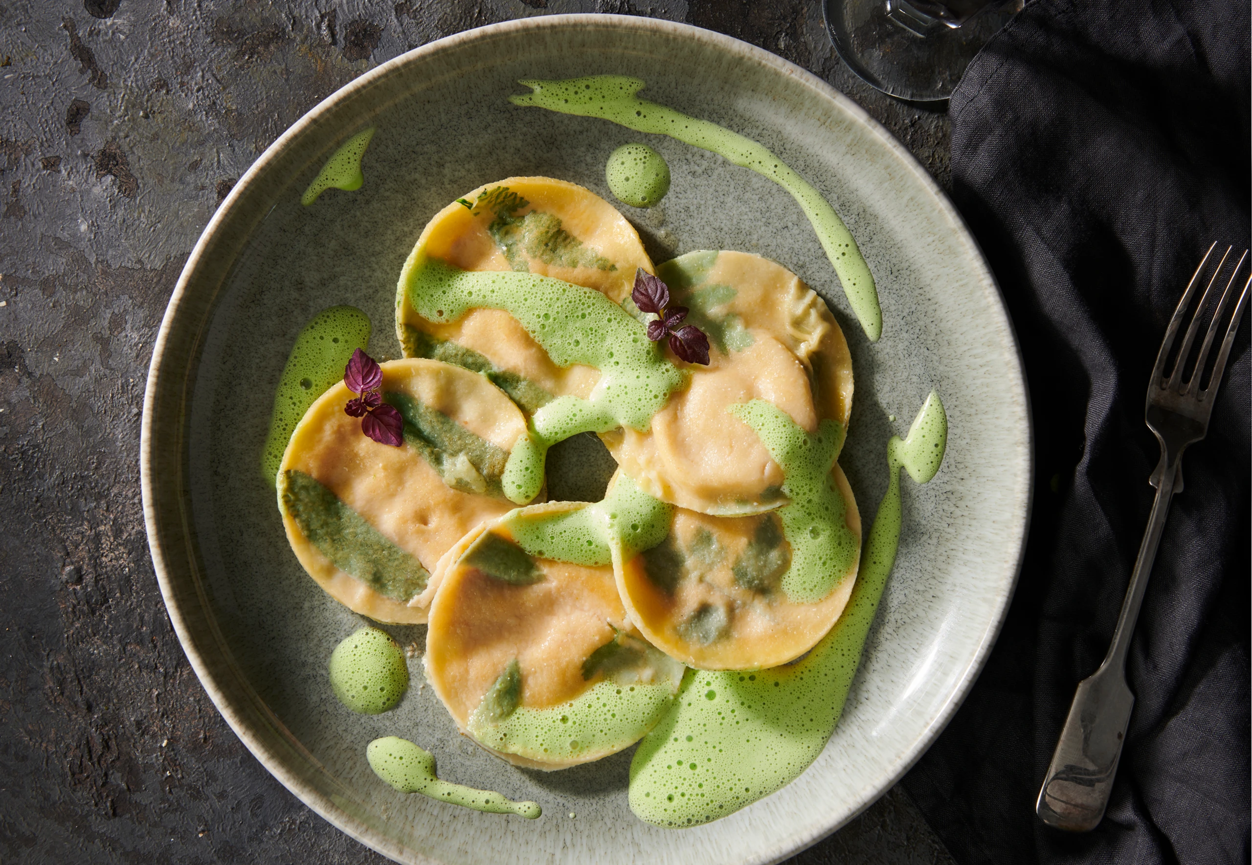 Für die Ravioli Kräuterblättchen abzupfen. Teig auf einer bemehlten Arbeitsfläche mit der Nudelmaschine dünn ausrollen. Eine Teigbahn mit Kräuterblättchen belegen, zweite darauflegen und nochmals durch die Nudelmaschine lassen. Scheiben (Ø 8 cm) ausstechen. Auf der Hälfte der Scheiben ein Häufchen der Fülle setzen. Rand mit Wasser bestreichen und mit den übrigen Teigscheiben belegen. Ränder gut andrücken und die Luft dabei herausdrücken.