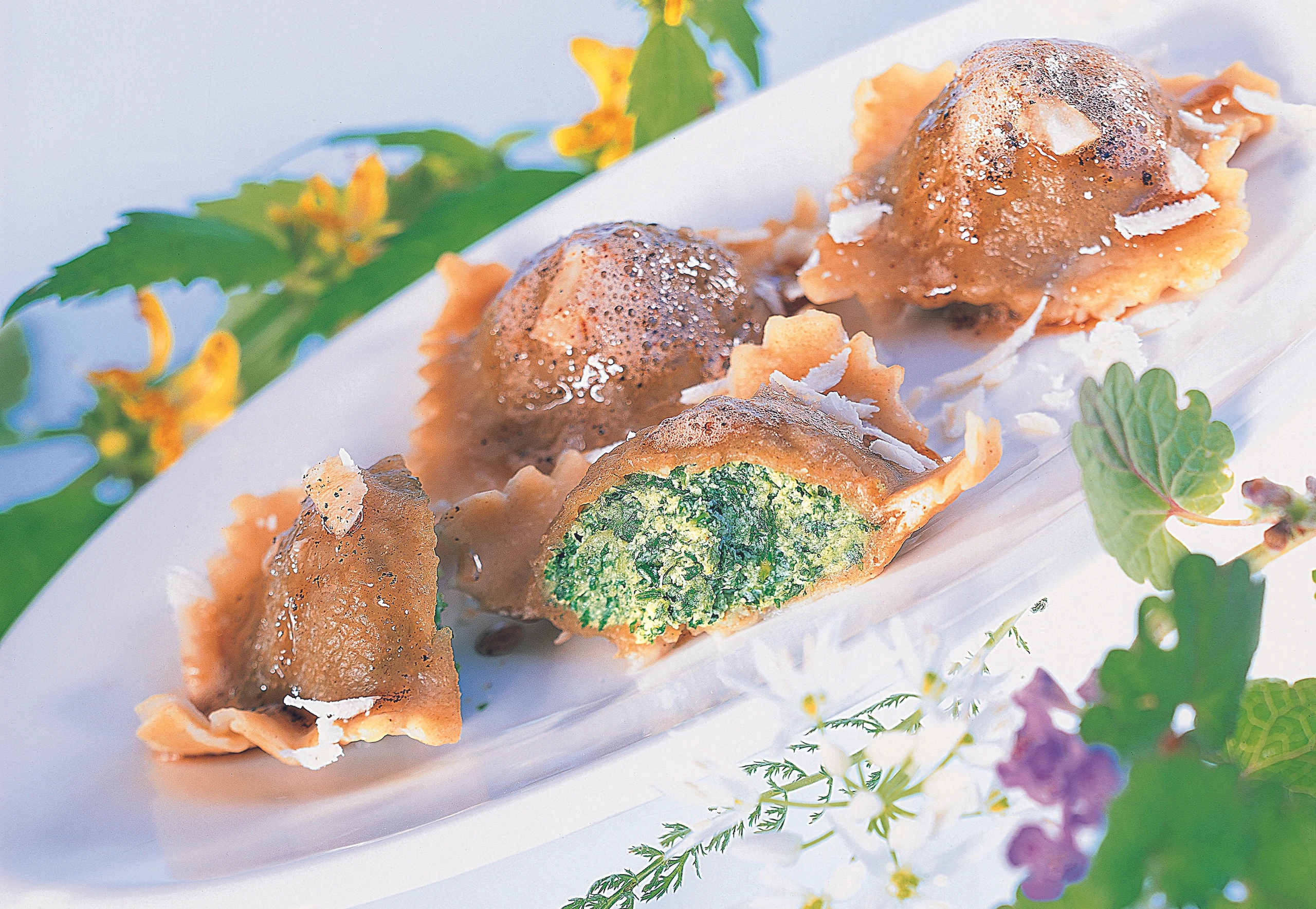 Eine Teigplatte in regelmäßigen Abständen (4–5 cm) mit der Fülle – je nach gewünschter Größe ca. 1 TL – belegen. Zweite Teigplatte darauf legen, Teig rund um die Fülle andrücken. Ravioli ausschneiden, die Kanten gut zusammendrücken und kurz übertrocknen lassen.