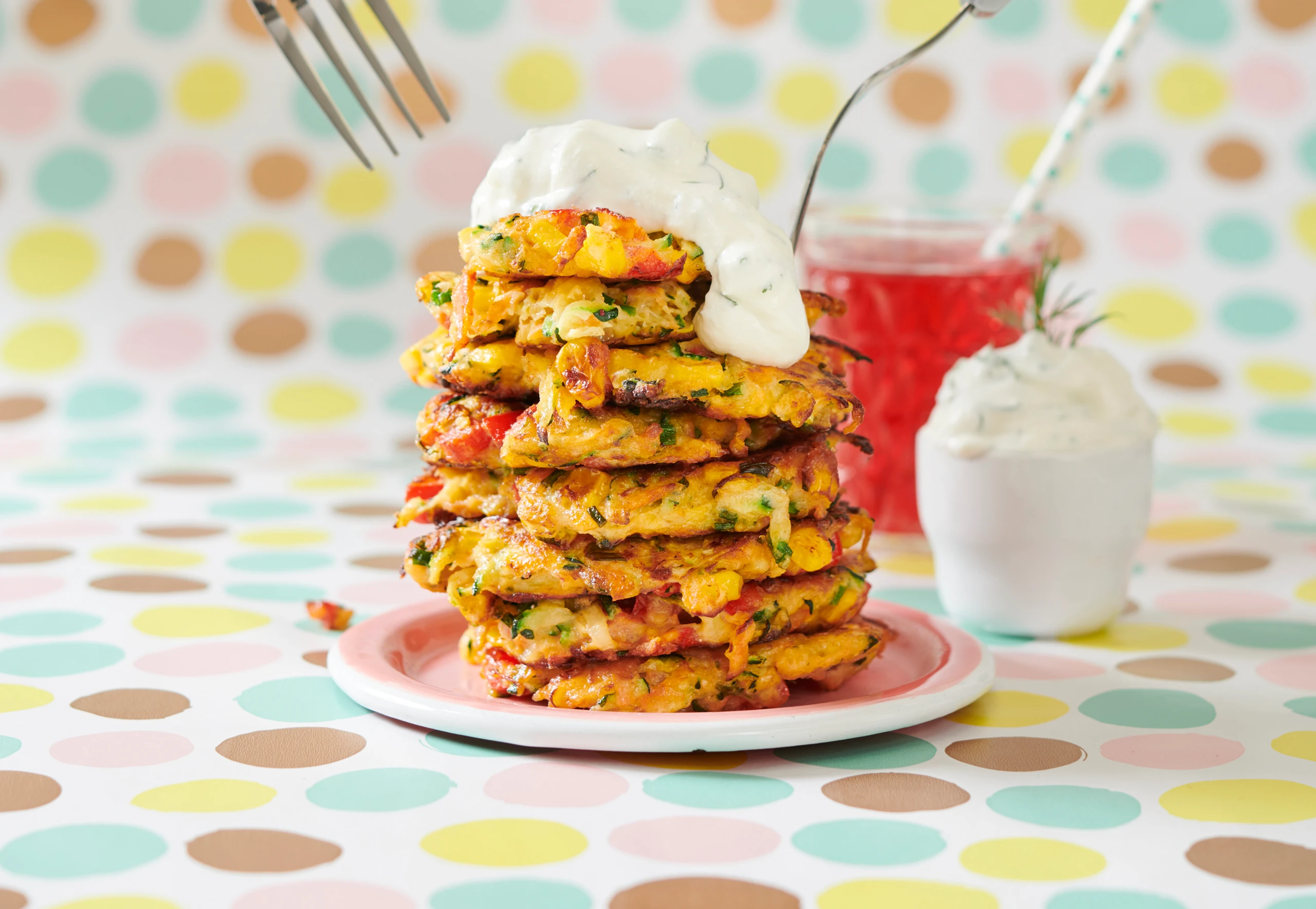 Für den Dip Topfen, Sauerrahm und Kräuter verrühren und mit Salz und Pfeffer abschmecken.
