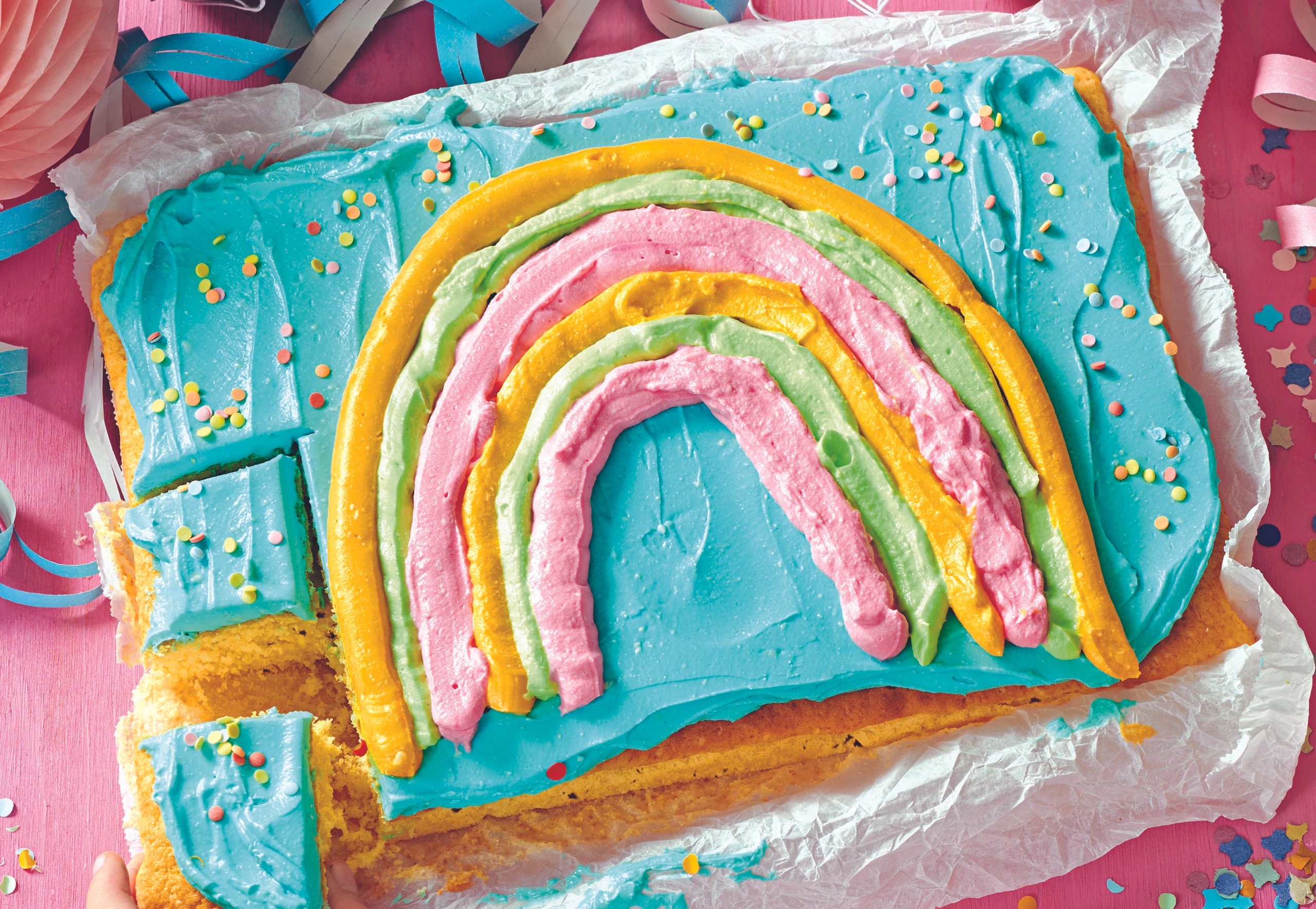 Butter und Zucker ca. 5 Minuten cremig mixen. Frischkäse unterrühren. Creme auf 4 Schüsseln verteilen und mit Lebensmittelfarben einfärben. Blaue Creme als „Himmel“ auf dem Kuchen verstreichen. Übrige Cremen in Dressiersäcke füllen und einen Regenbogen aufdressieren. Mit Zuckerdekor bestreuen.