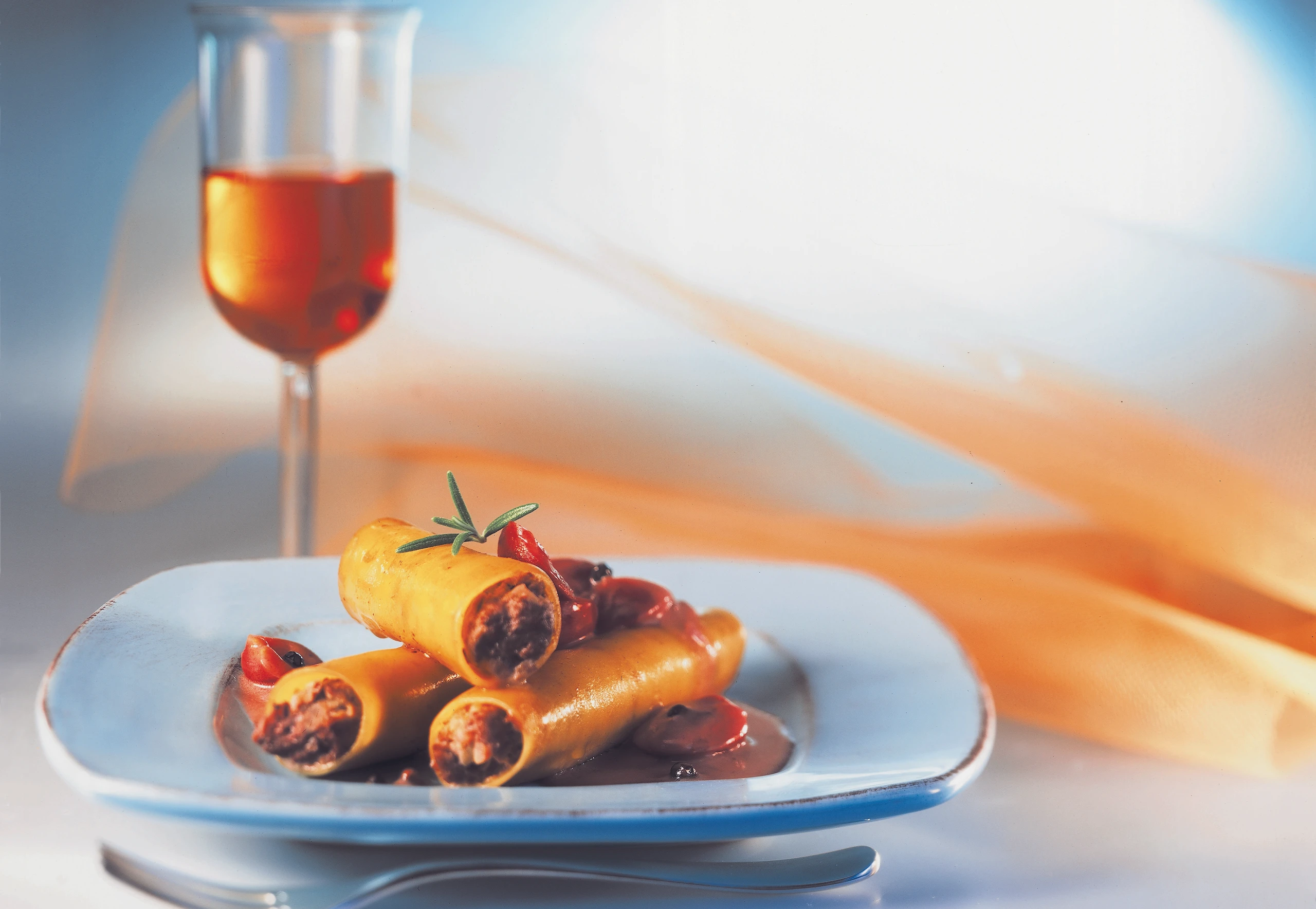 Cannelloni aus dem Rohr nehmen und mit der Kirschensauce servieren.