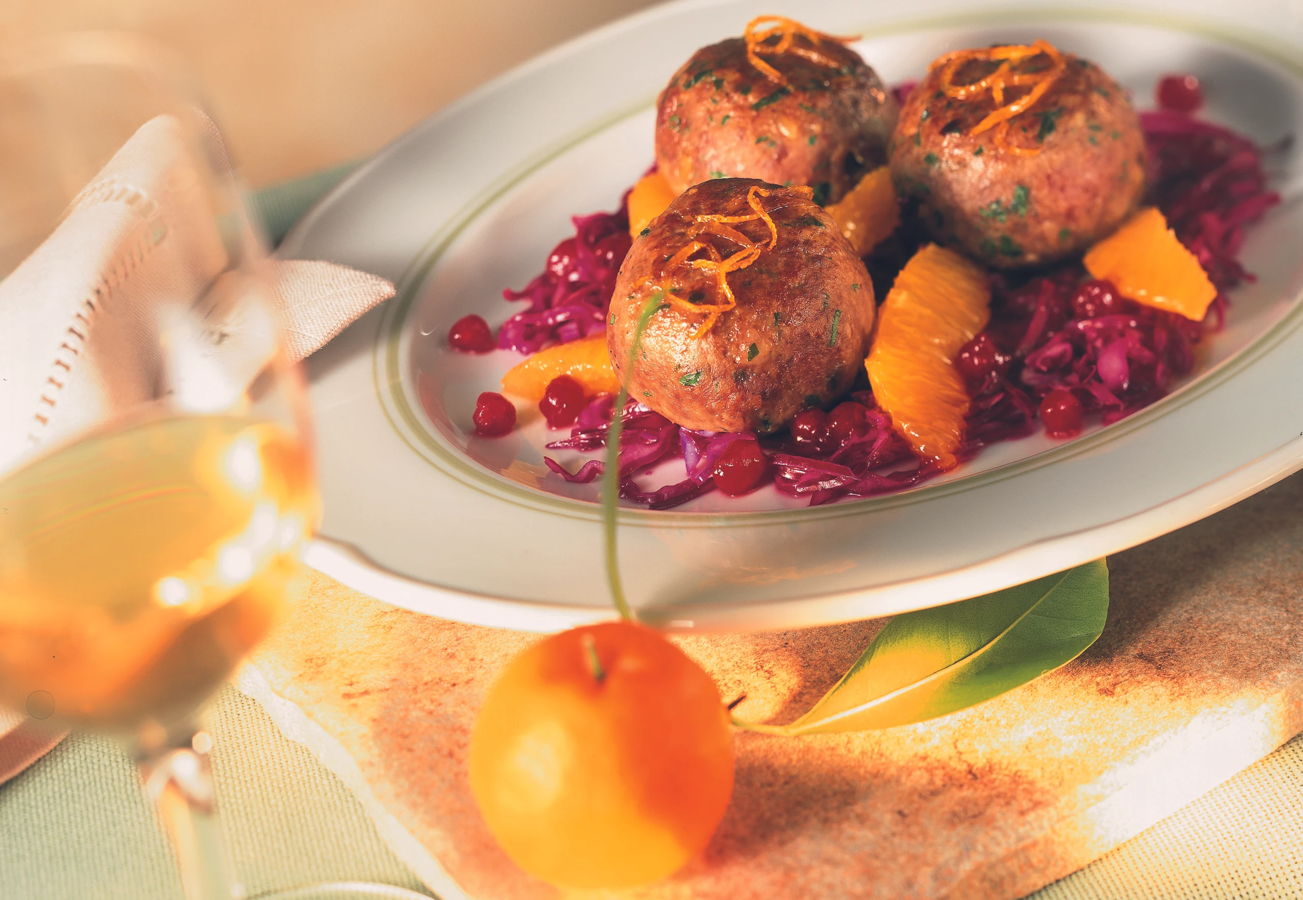 Reh-Polpette mit Orangenragout und Rotkrautsalat