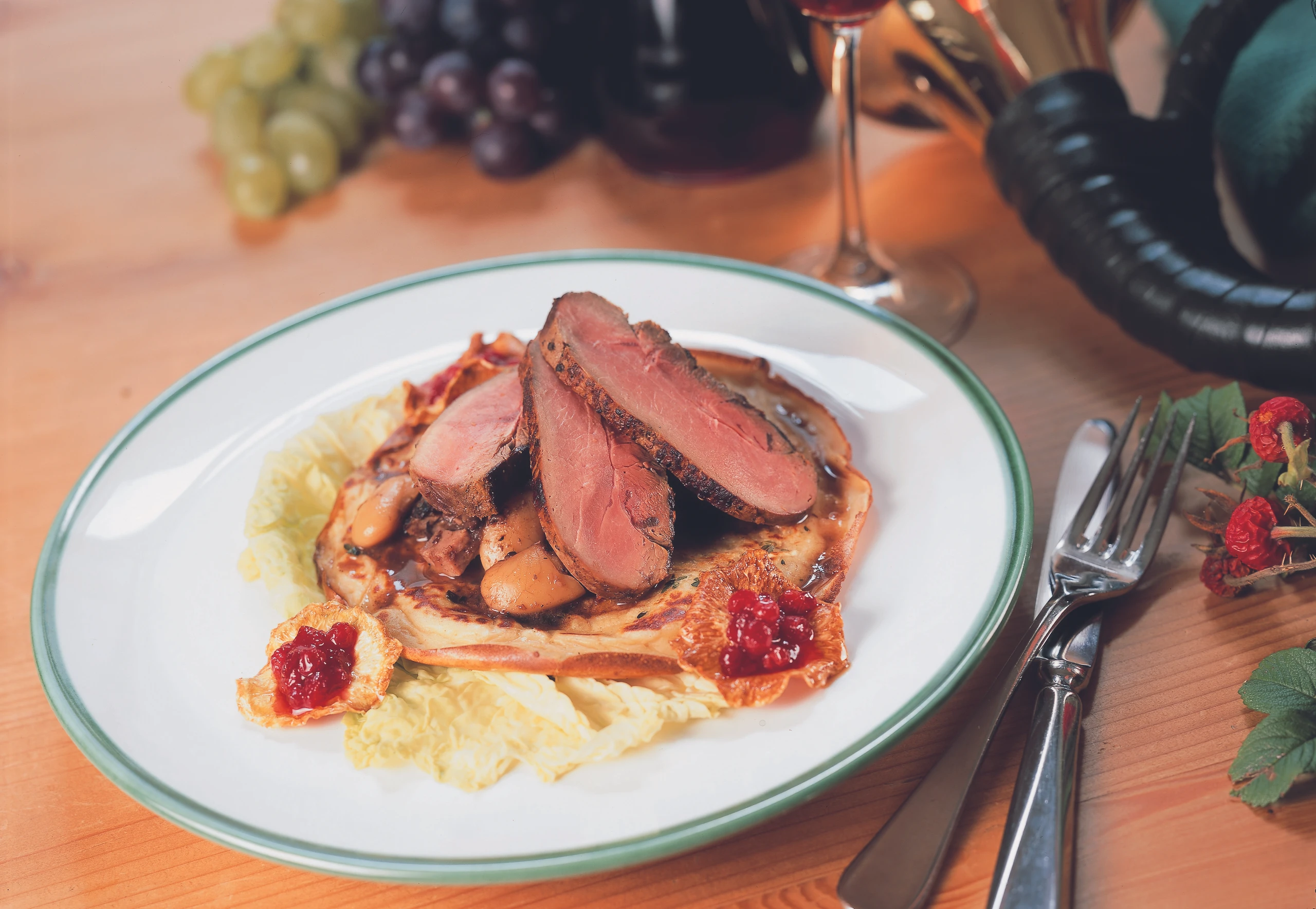 Rehbratel aus dem Rohr nehmen, in Scheiben schneiden. Teller eventuell mit blanchierten Kohlblättern und den Palatschinken belegen, Ragout, Zellerschüsselchen und Fleisch darauf anrichten.