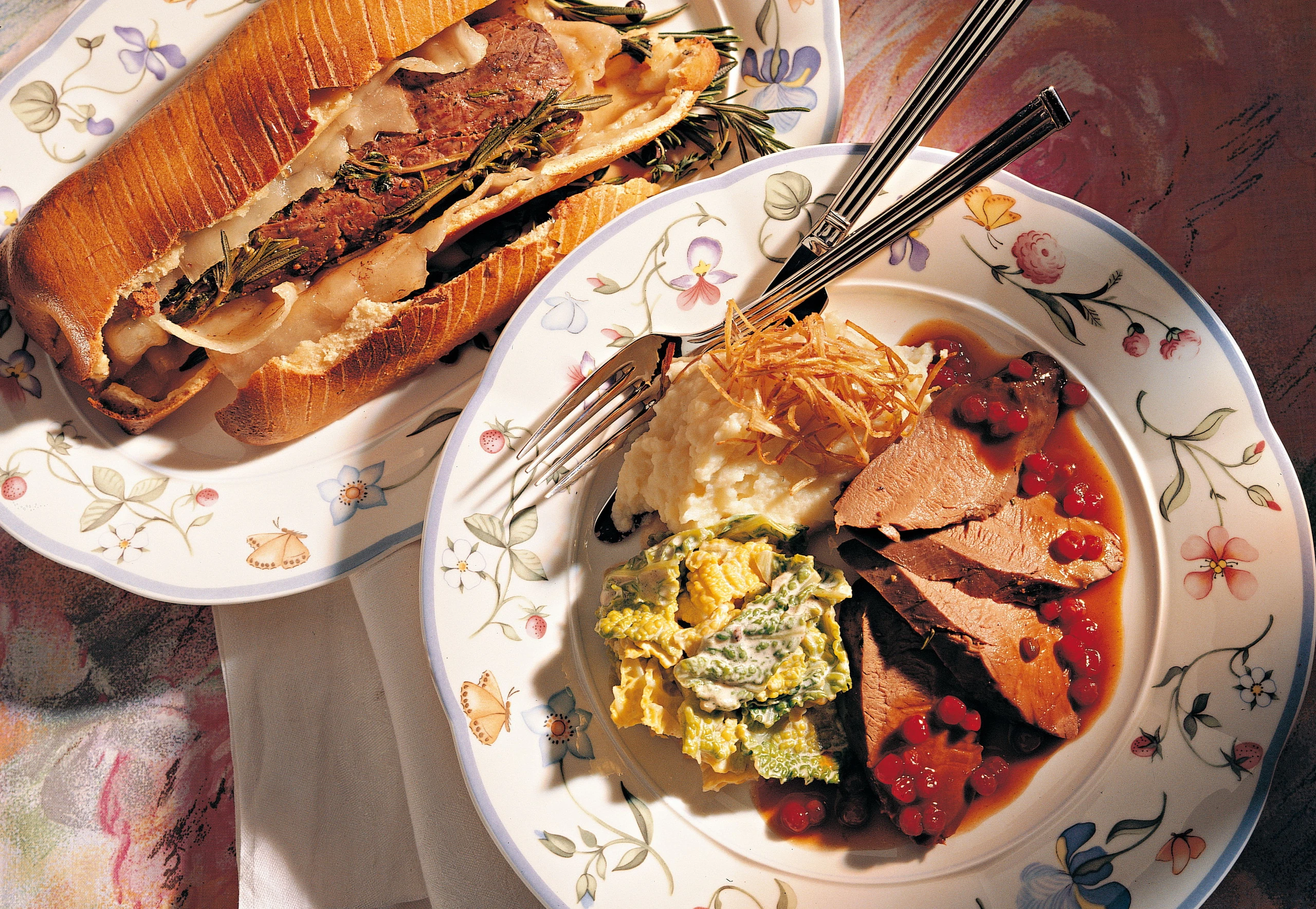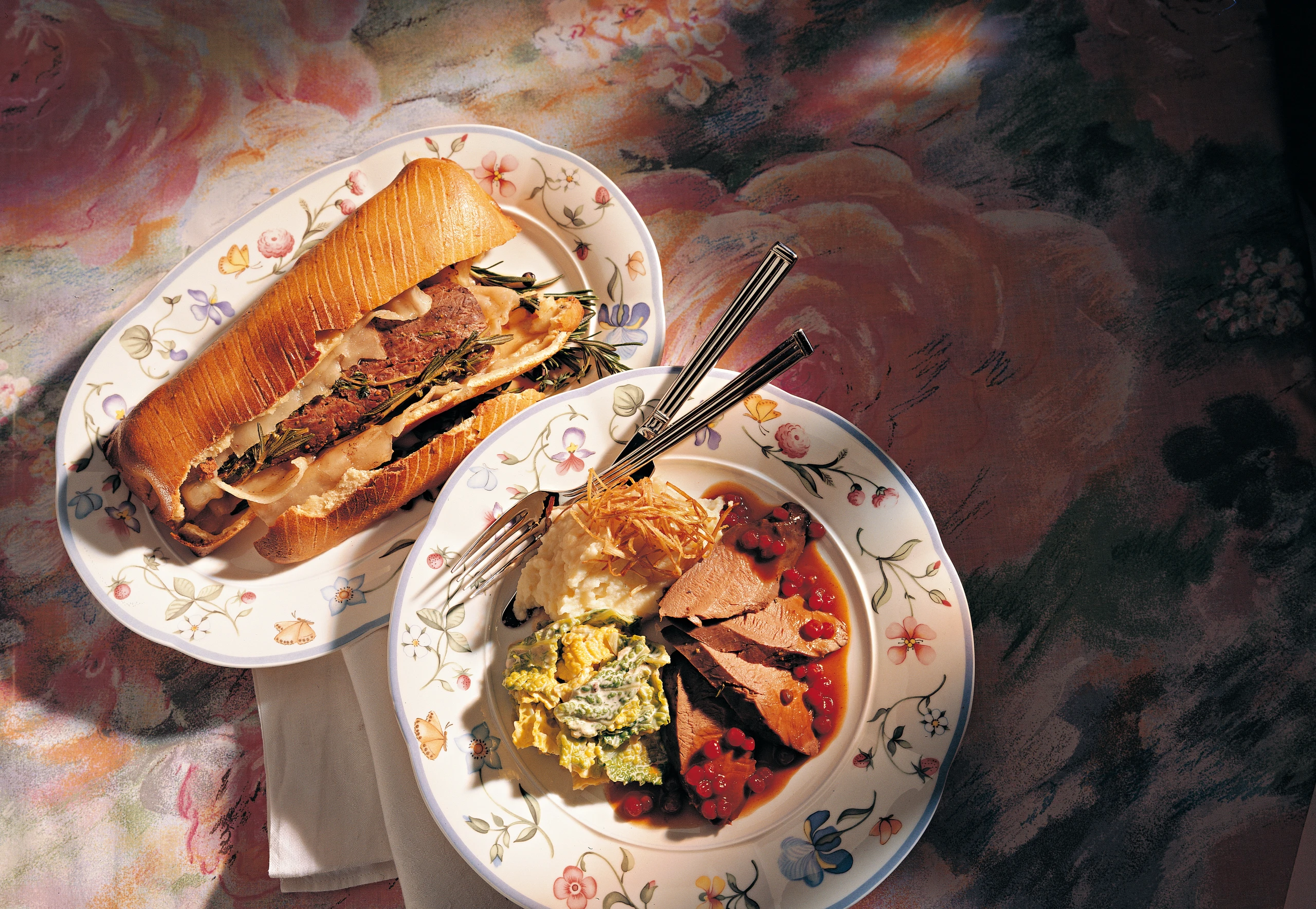 Teig aufbrechen, das Fleisch herausnehmen, Speck enfernen und Fleisch in dünne Scheiben schneiden. Als Beilagen serviert man Rahmkohl, Sellerie-Püree und eventuell Kroketten.