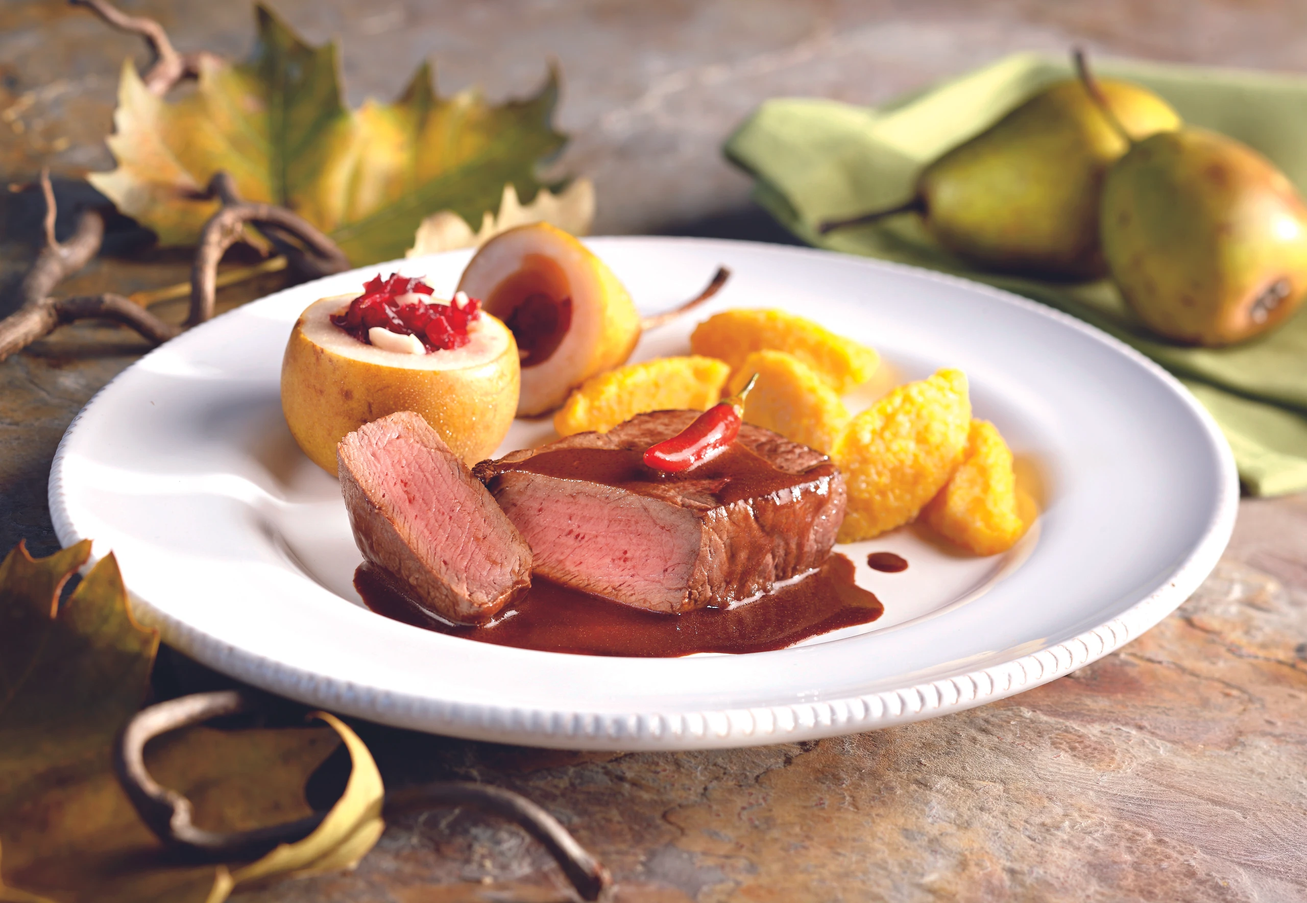 Rehfilet mit Rotwein-Schokolade-Sauce und Kürbisnockerln