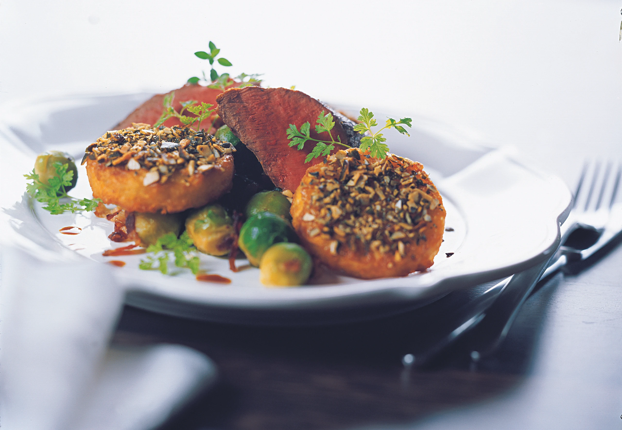 Rehfilet quer zur Faser in Scheiben schneiden und anrichten. Eventuell mit Kürbiskernöl und Kerbel garnieren. Dazu passen mit Kürbiskernen bestreute Rösti.