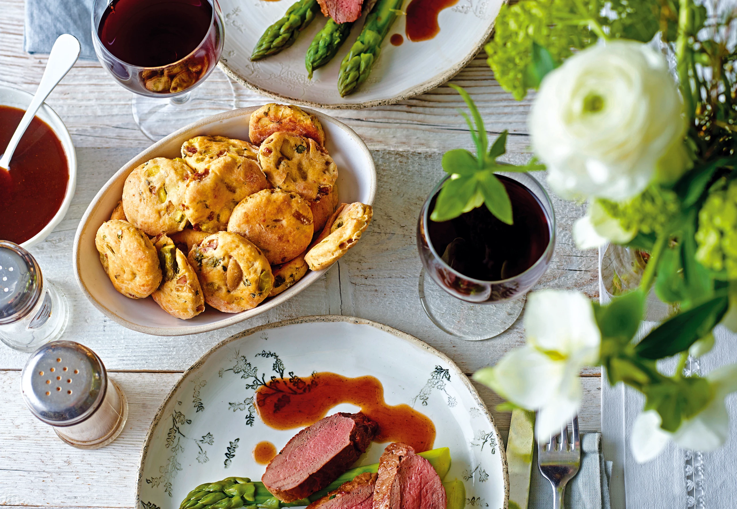 Rehfilet mit Portweinsauce, Spargel und Scones
