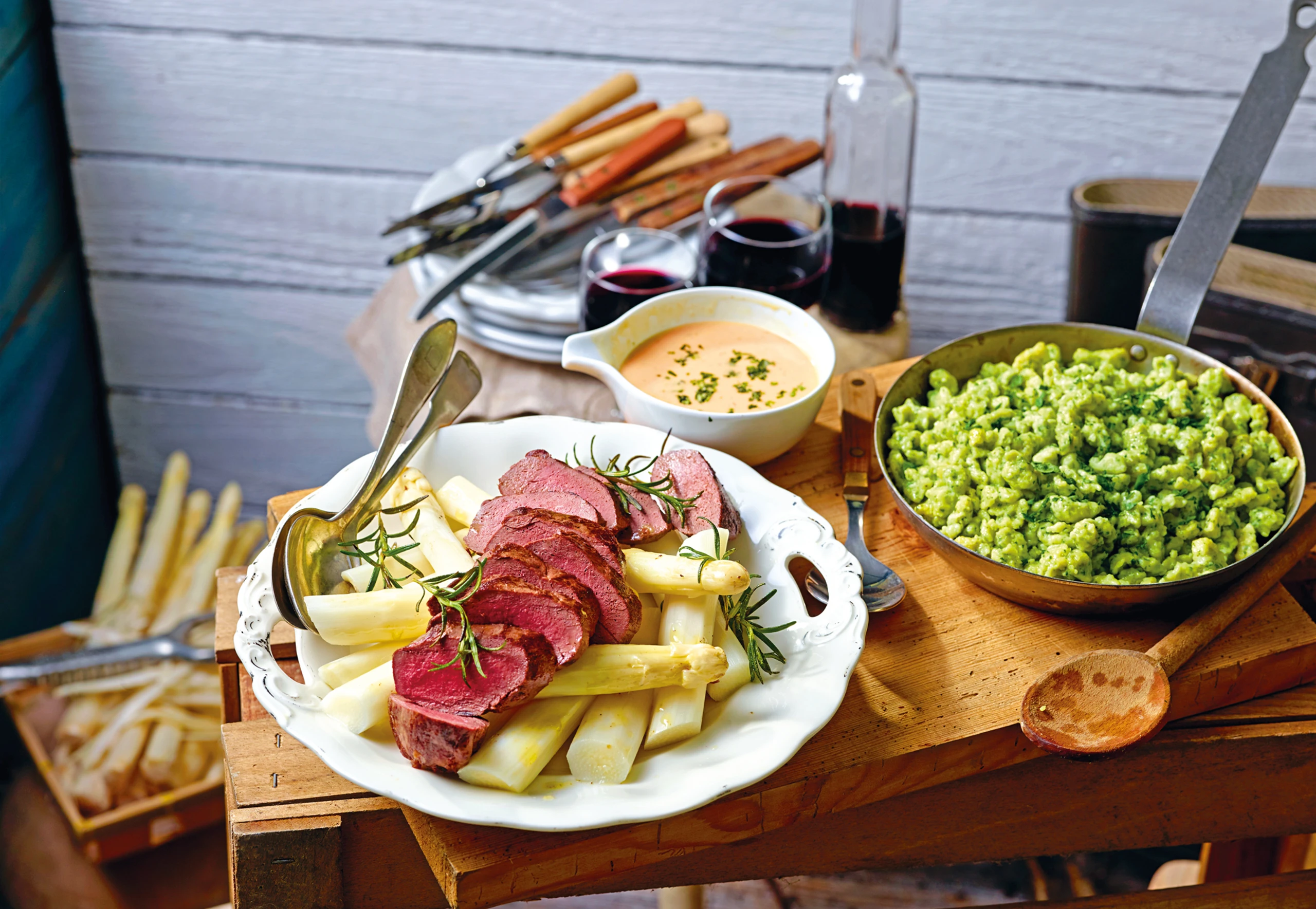 Rehfilet mit Spargel, Rhabarbersauce und Spätzle