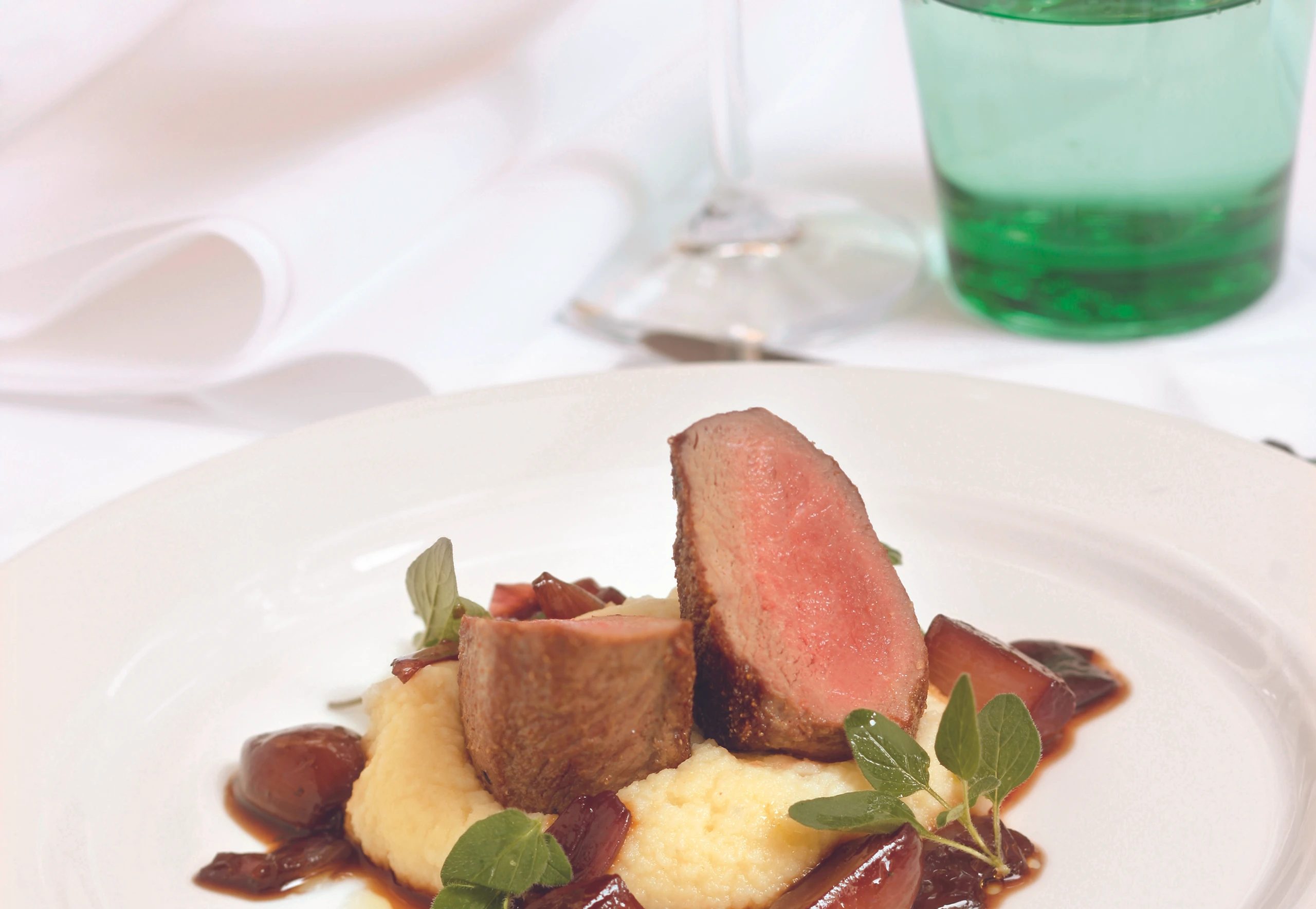 Rehfilets mit Rotwein-Schalotten und Selleriepüree