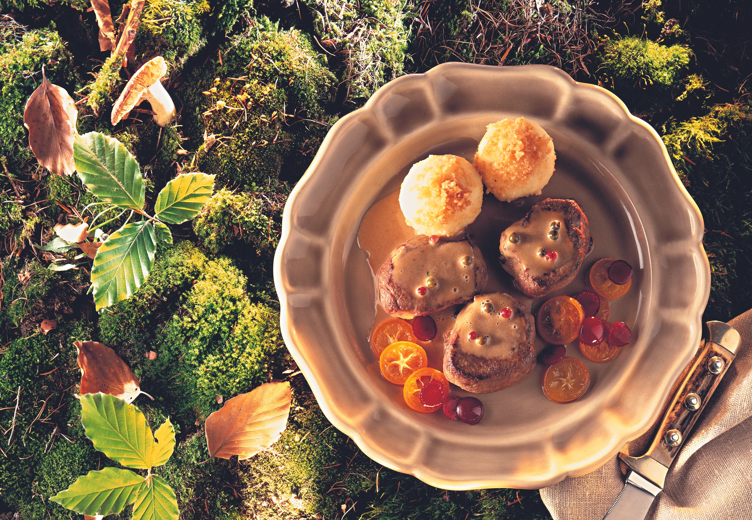 Rehmedaillons mit Pfeffersauce und Maroniknöderln