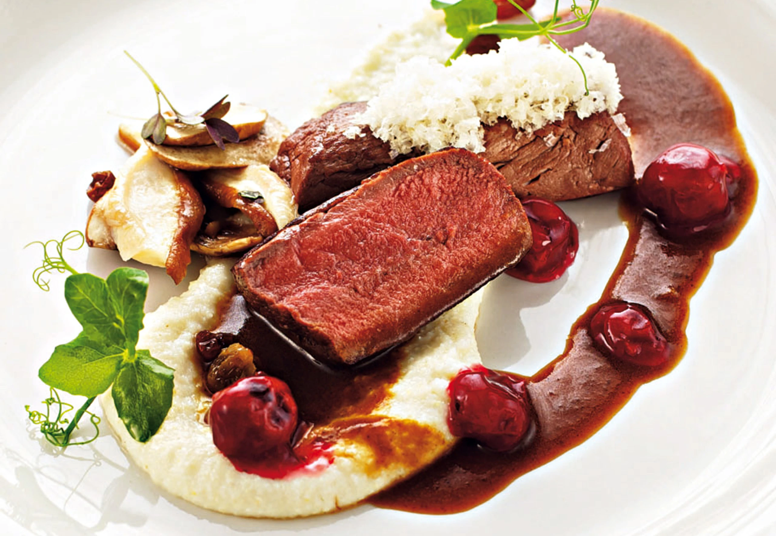 Kirschen und Pilze erwärmen. Fleisch in Scheiben schneiden, mit Polenta, Pilzen, Kirschen und Sauce anrichten, evtl. mit geriebenen Macadamia bestreuen.