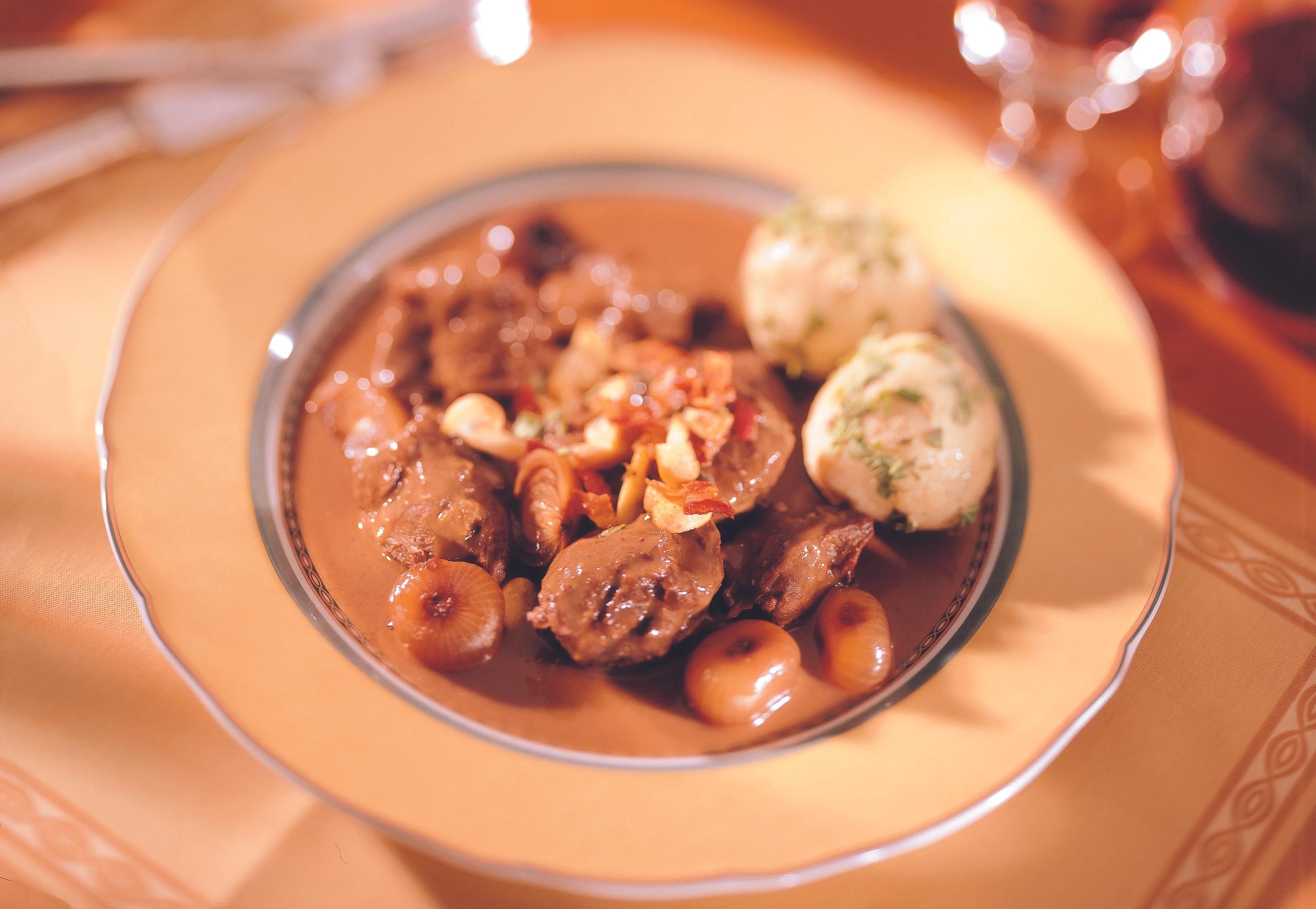 Suppengrün waschen und in kleine Stücke schneiden. Rehschulter zuputzen (Häutchen und Sehnen wegschneiden). Fleisch in ca. 3 cm große Stücke schneiden, mit Salz und zerstoßenem Pfeffer würzen. Schalotten-Zwiebeln in lauwarmes Wasser legen (sie lassen sich dann leichter schälen).