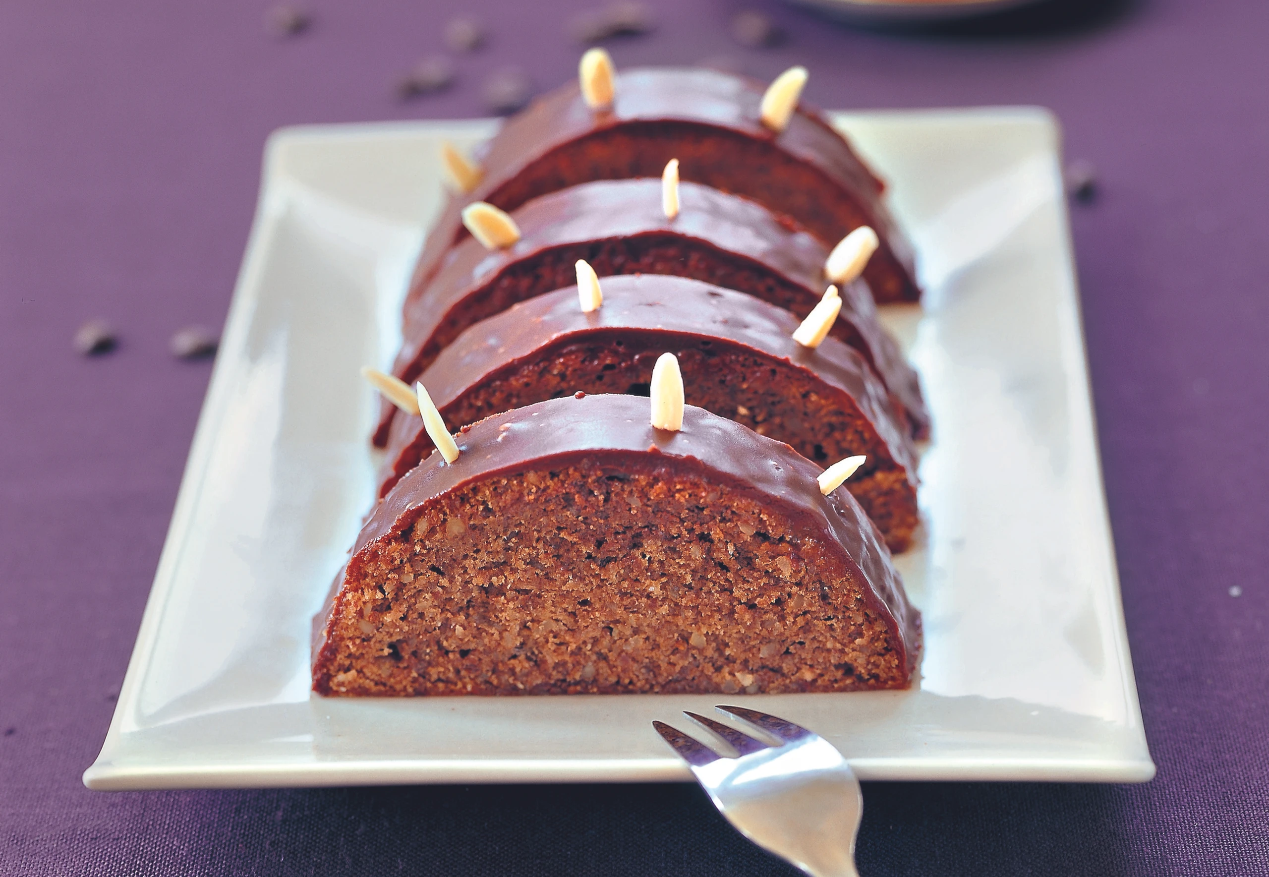 Für die Glasur Kuvertüre in kleine Stücke schneiden, Wasser und Kristallzucker aufkochen, Kuvertüre zugeben und unter Rühren auflösen. Glasur auf ca. 35 °C abkühlen lassen, über den Rehrücken gießen und mit den Mandelstiften garnieren. Kuchen zum Festwerden der Glasur kühl stellen.