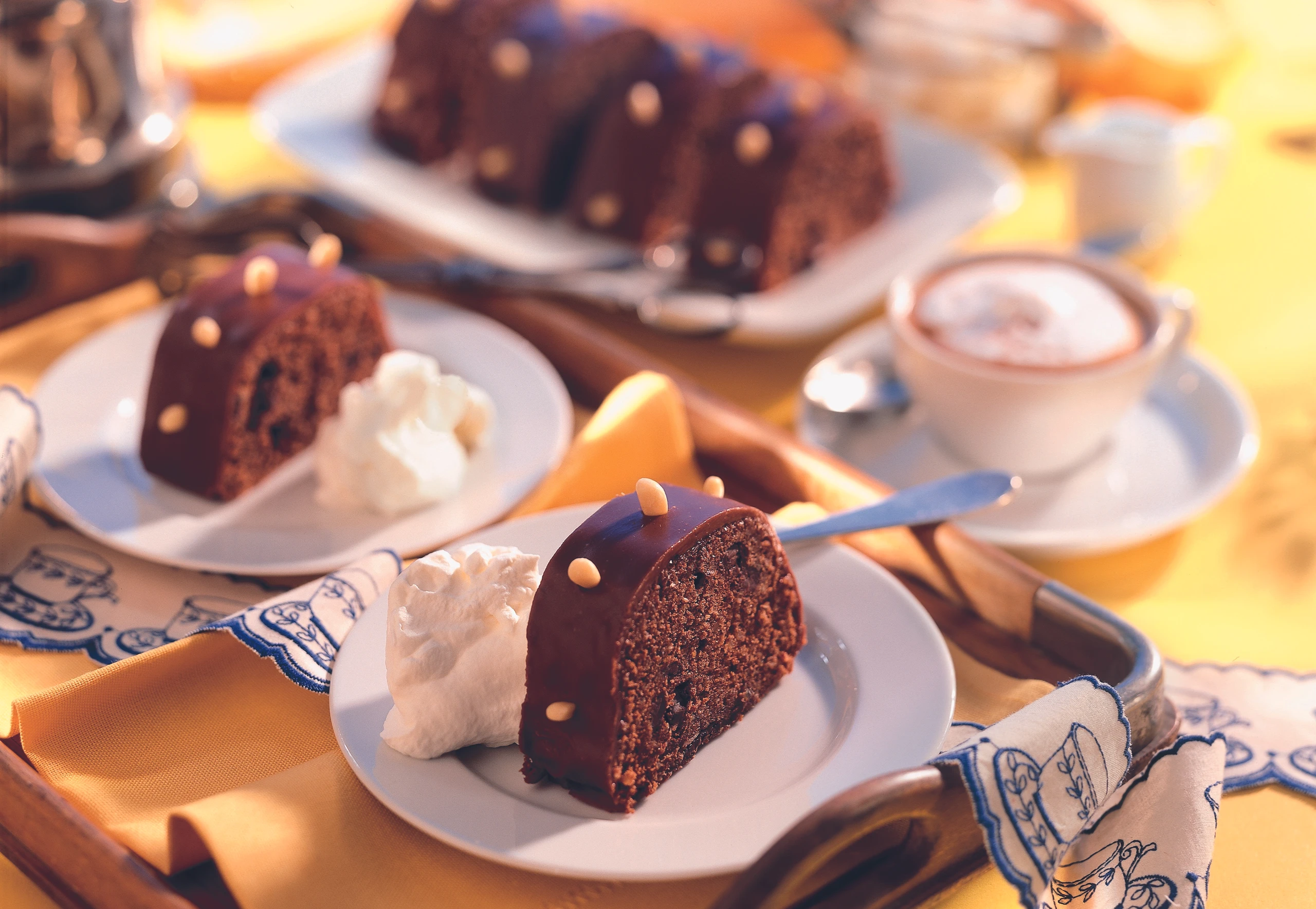 Eiklar mit Stärke und Zucker zu cremigem Schnee schlagen. Die Hälfte vom Schnee in die Schokolademasse rühren, restlichen Schnee und die Mandel-Mehlmischung unterheben. Masse in die Form füllen, zum Rand hin hochstreichen und 45–50 Minuten (mittlere Schiene / Gitterrost) backen.