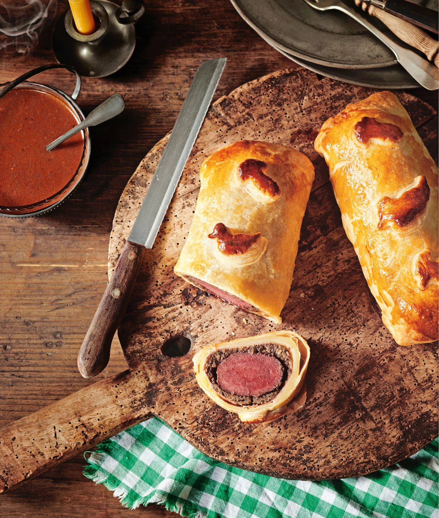 Rohr auf 200°C vorheizen. Backblech mit Backpapier belegen. Auf einer leicht bemehlten Arbeitsfläche einen Teig aufrollen und das Papier abziehen. Folie vom Filet entfernen und das Filet im unteren Teigdrittel auflegen. Filet im Teig eng einrollen. Überstehenden Teig abdrücken, wegschneiden und für die Garnitur beiseite legen. Rolle mit der Naht nach unten auf das Blech geben und mit Ei bestreichen. Diesen Vorgang mit übrigem Filet und restlichem Teig wiederholen.